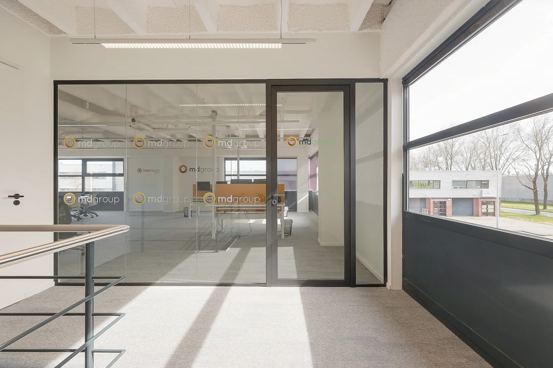 - scheidingswanden van glas of afgewerkt en gesausd
