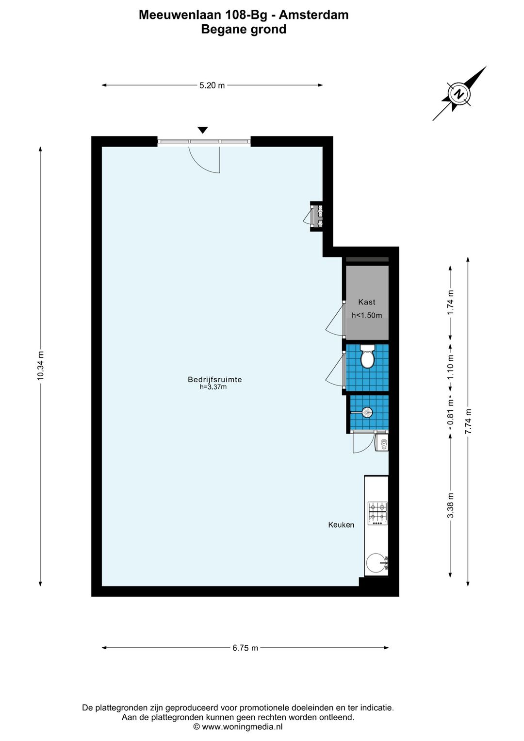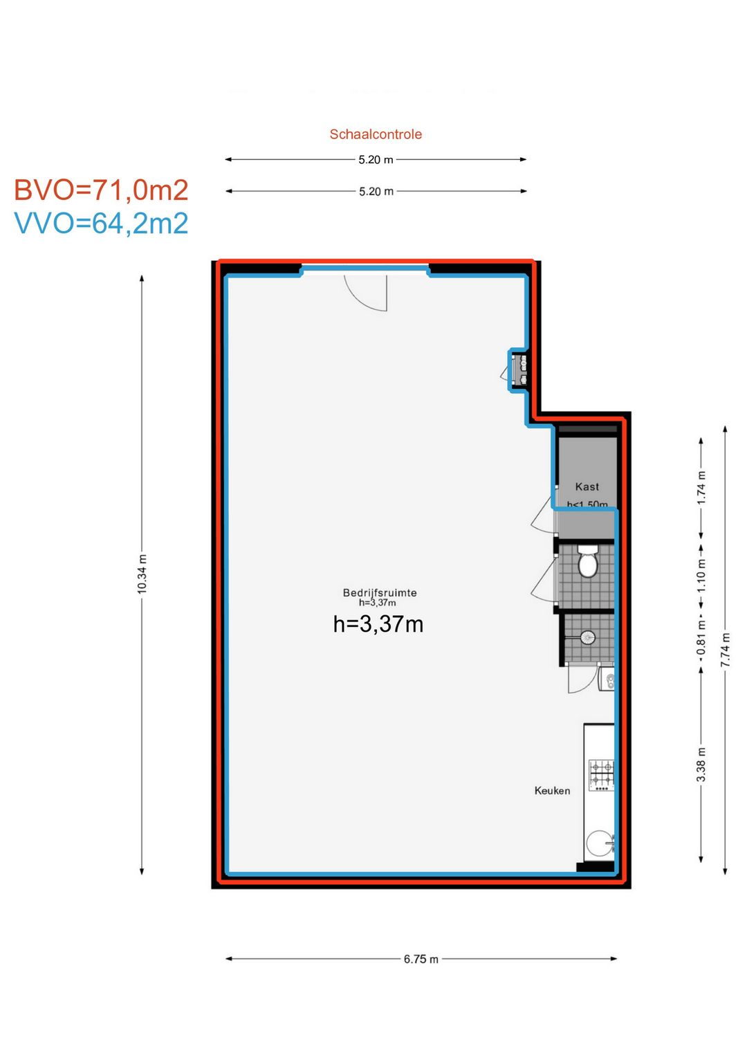 Deze bedrijfsruimte is gemeten volgens de Meetinstructie. De Meetinstructie is gebaseerd op de NEN2580. De Meetinstructie is bedoeld om een meer eenduidige manier van meten toe te passen voor het geven van een indicatie van de gebruiksoppervlakte. De Meetinstructie sluit verschillen in meetuitkomsten niet volledig uit, door bijvoorbeeld interpretatieverschillen, afrondingen of beperkingen bij het uitvoeren van de meting. Hoewel wij met veel zorg hebben opgemeten kan het zijn dat er verschillen zijn in de afmetingen. Noch verkoper noch de makelaar accepteert enige aansprakelijkheid voor deze verschillen. De maatvoeringen worden door ons gezien als zuiver indicatief. Indien de exacte maatvoering voor jou van belang is, raden wij jou aan de maten zelf te (laten) meten.