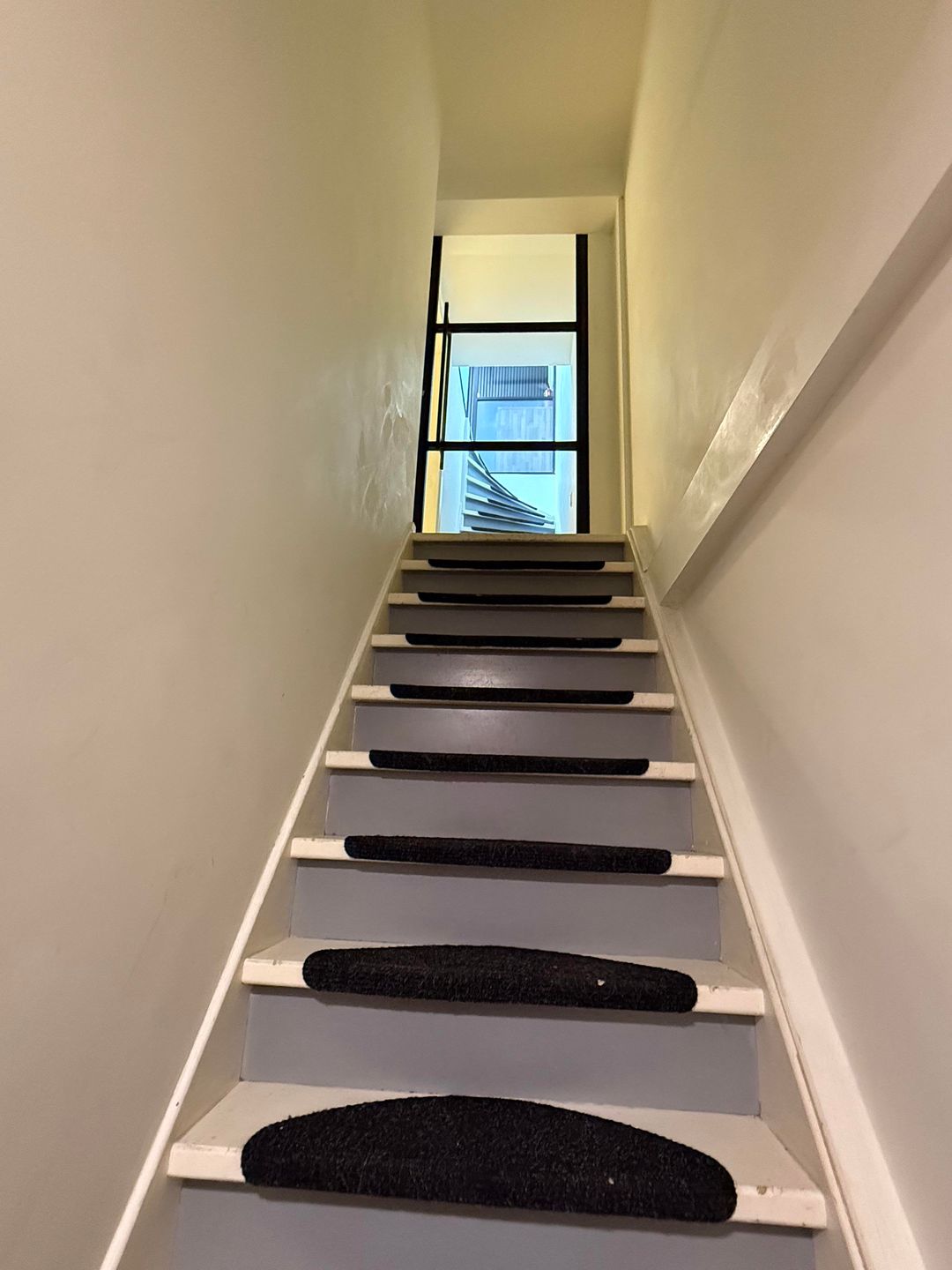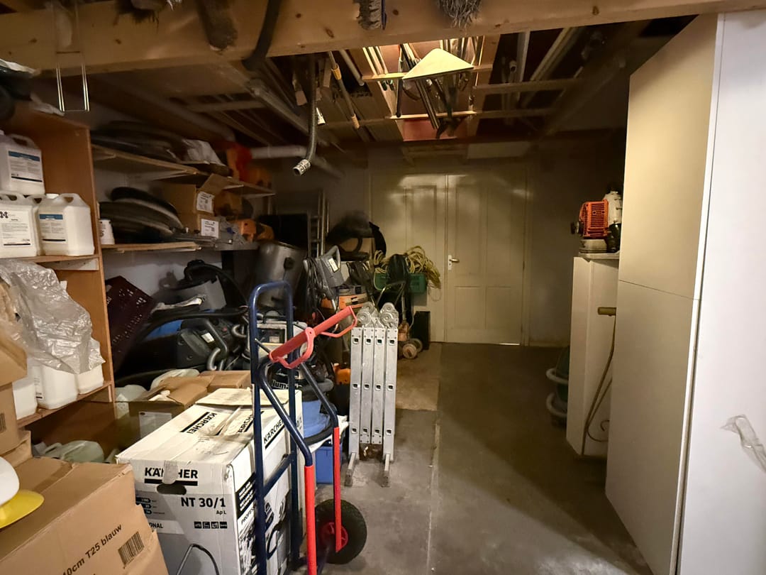 De trap in de hal leidt naar de 1e verdieping, waar zich een opslagruimte bevindt (ook bruikbaar als meeting ruimte) met aangrenzende badkamer, toilet en een tweede opslagruimte.