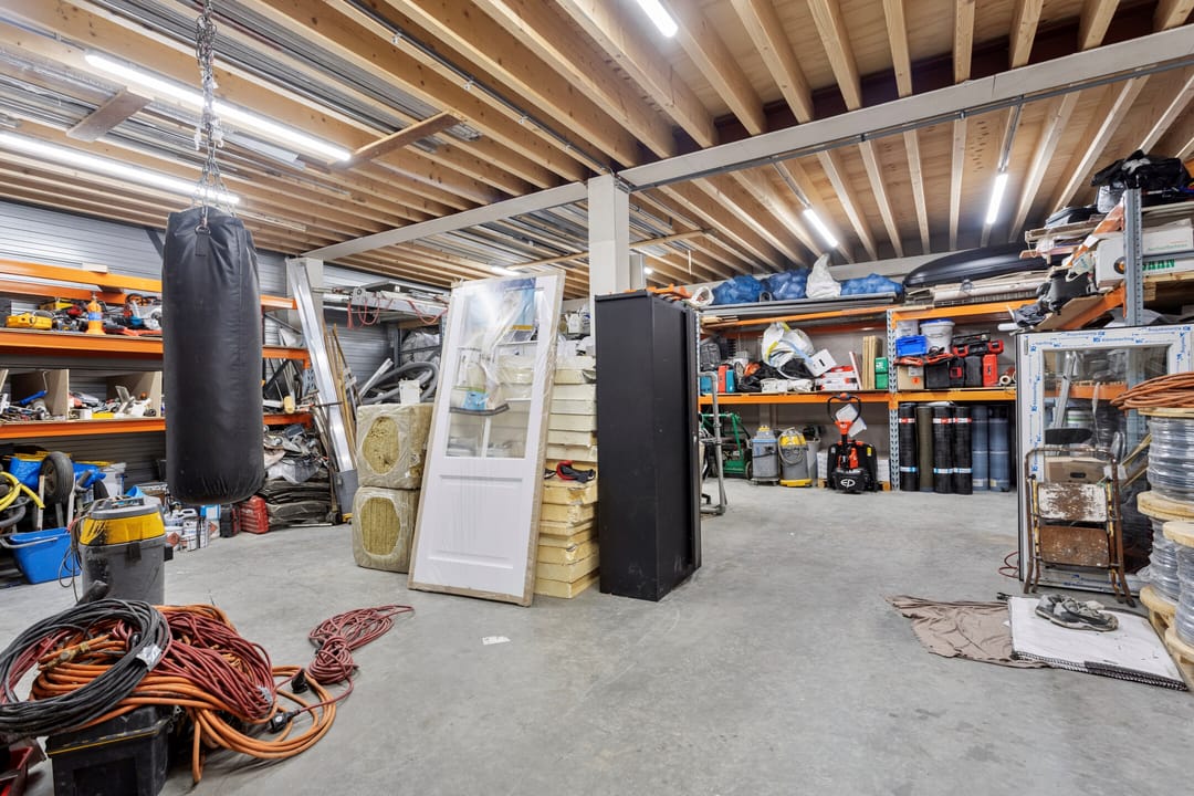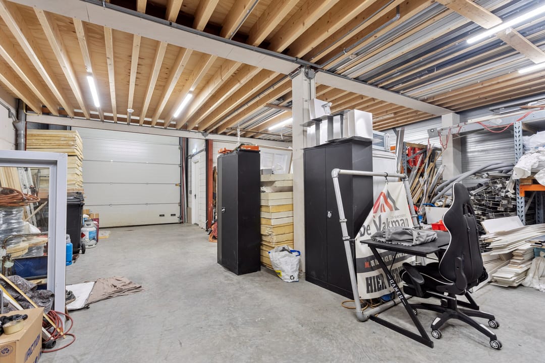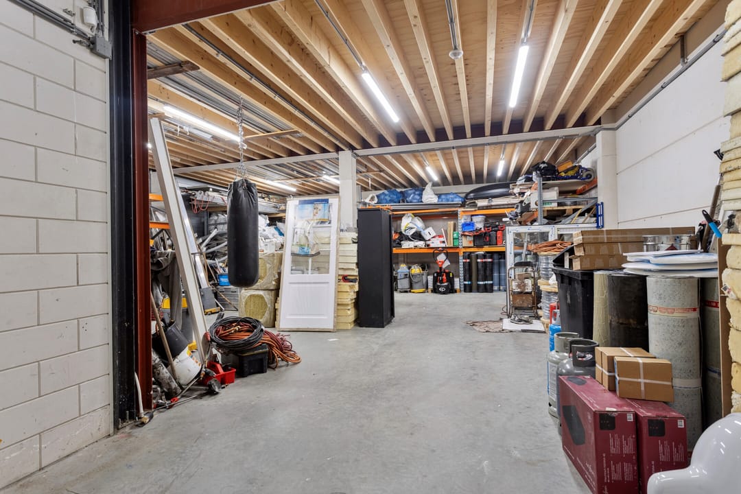 De bedrijfsruimte op de begane grond is ruim opgezet en daardoor heel geschikt als opslag of magazijn. Met een diepte van ruim twaalf meter en een breedte van bijna negen meter kunt u hier veel opslagcapaciteit kwijt. Van stellingkasten tot werkruimte, het past allemaal. Dankzij de roldeur en overkapping is laden en lossen bovendien eenvoudig geregeld.