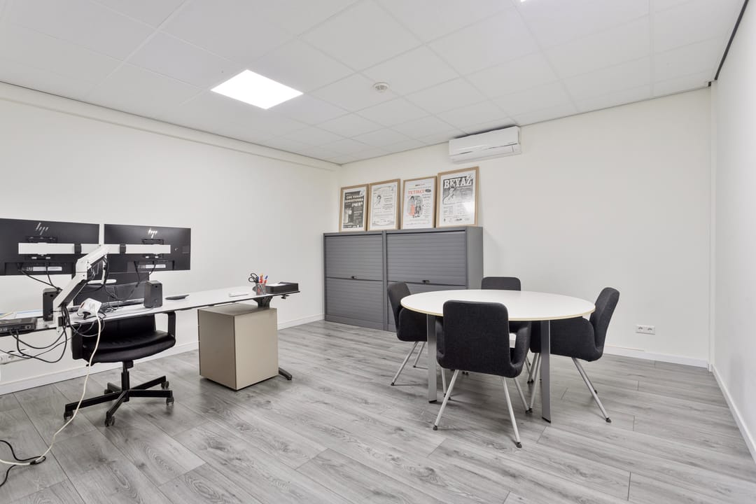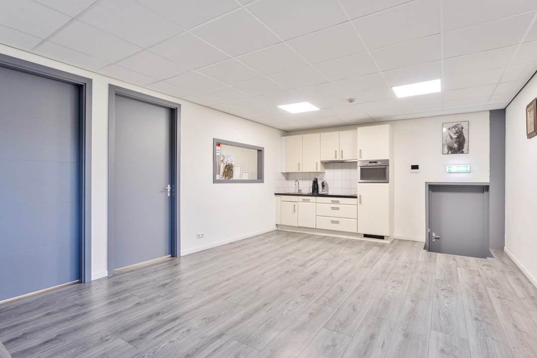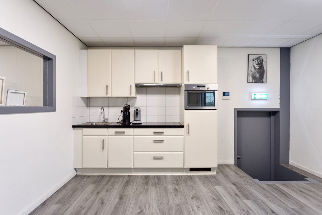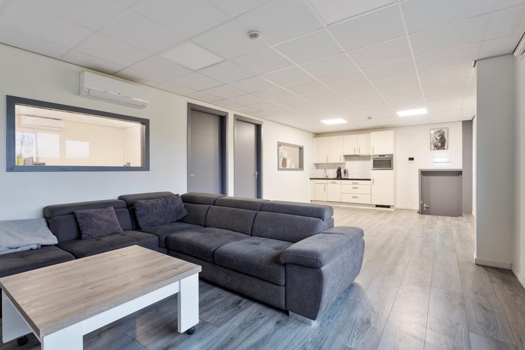 De vaste trap brengt u naar de eerste verdieping, waar twee kantoorruimtes liggen die licht, fris en comfortabel aanvoelen. De airco draagt bij aan een fijne werktemperatuur, waardoor dit prettige plekken zijn om te concentreren of te overleggen. Aansluitend vindt u een open living met keuken, die door de open indeling een informele en toegankelijke sfeer heeft. Hier kunt u gemakkelijk een loungehoek, eettafel of informele vergaderplek creëren. De keuken is volledig uitgerust met een inductiekookplaat, ovencombinatie, koelkast, spoelbak en voldoende opbergmogelijkheden.