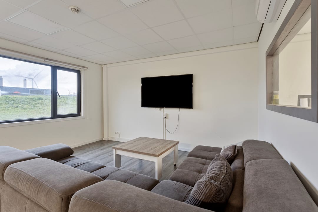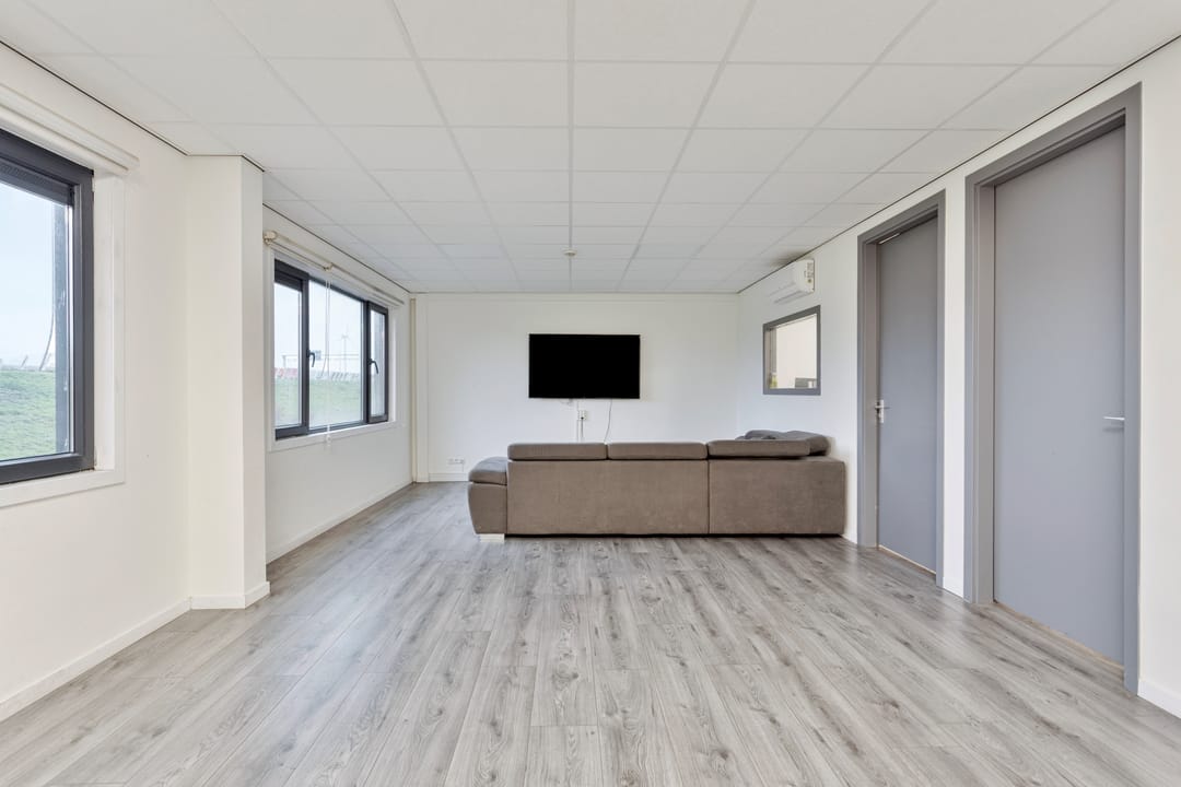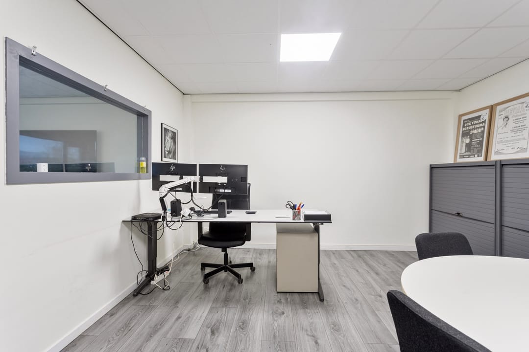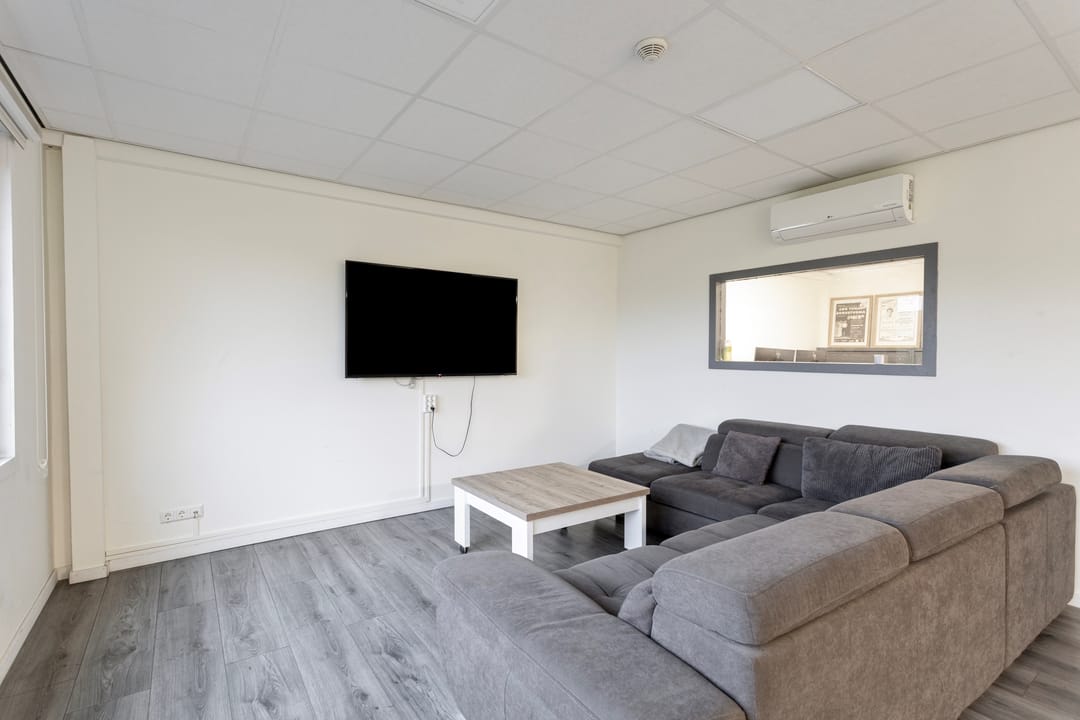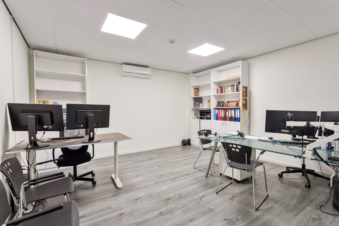 De vaste trap brengt u naar de eerste verdieping, waar twee kantoorruimtes liggen die licht, fris en comfortabel aanvoelen. De airco draagt bij aan een fijne werktemperatuur, waardoor dit prettige plekken zijn om te concentreren of te overleggen. Aansluitend vindt u een open living met keuken, die door de open indeling een informele en toegankelijke sfeer heeft. Hier kunt u gemakkelijk een loungehoek, eettafel of informele vergaderplek creëren. De keuken is volledig uitgerust met een inductiekookplaat, ovencombinatie, koelkast, spoelbak en voldoende opbergmogelijkheden.