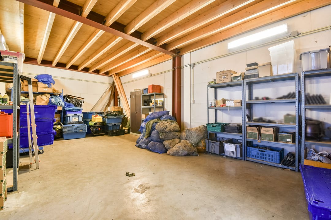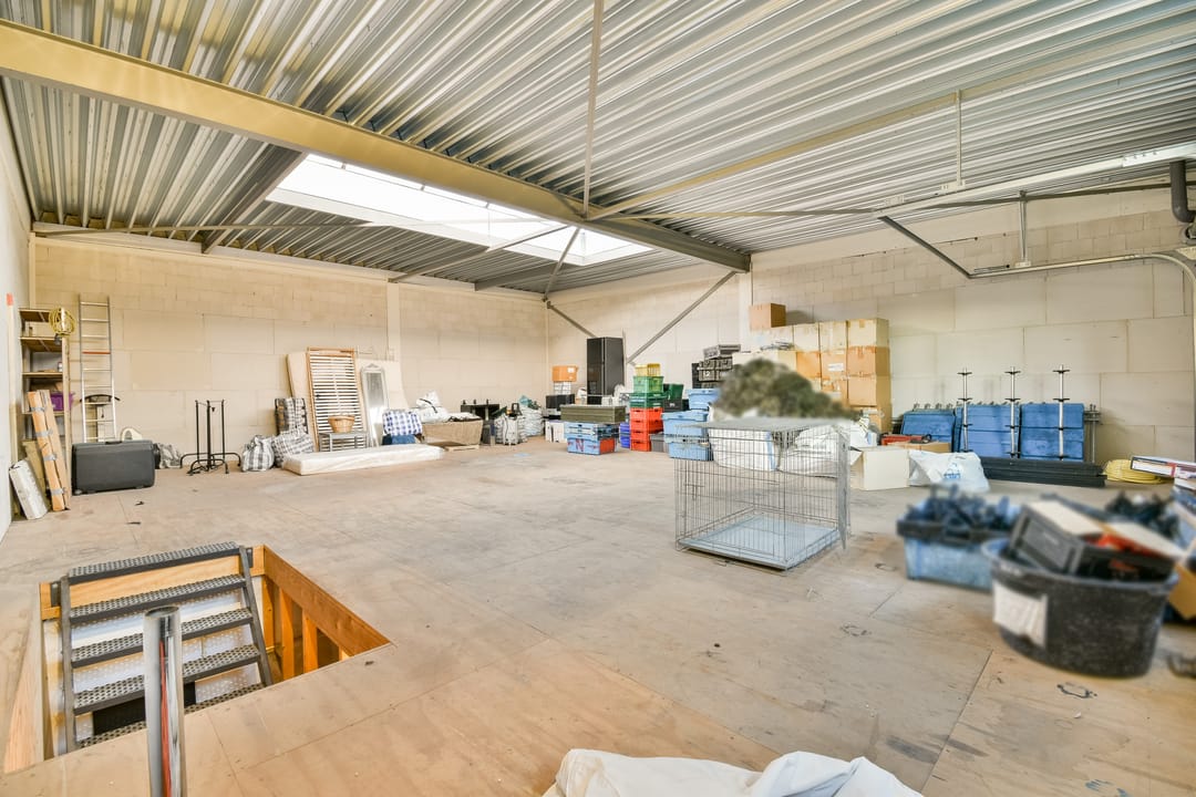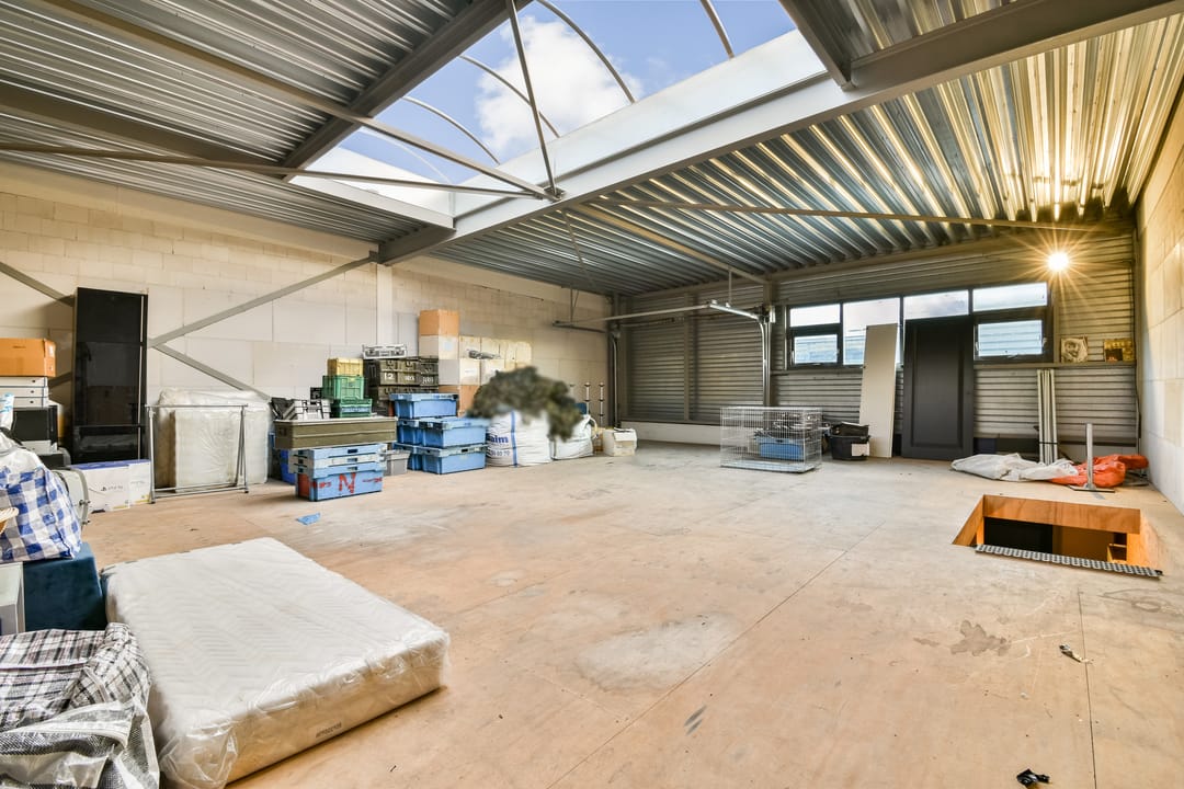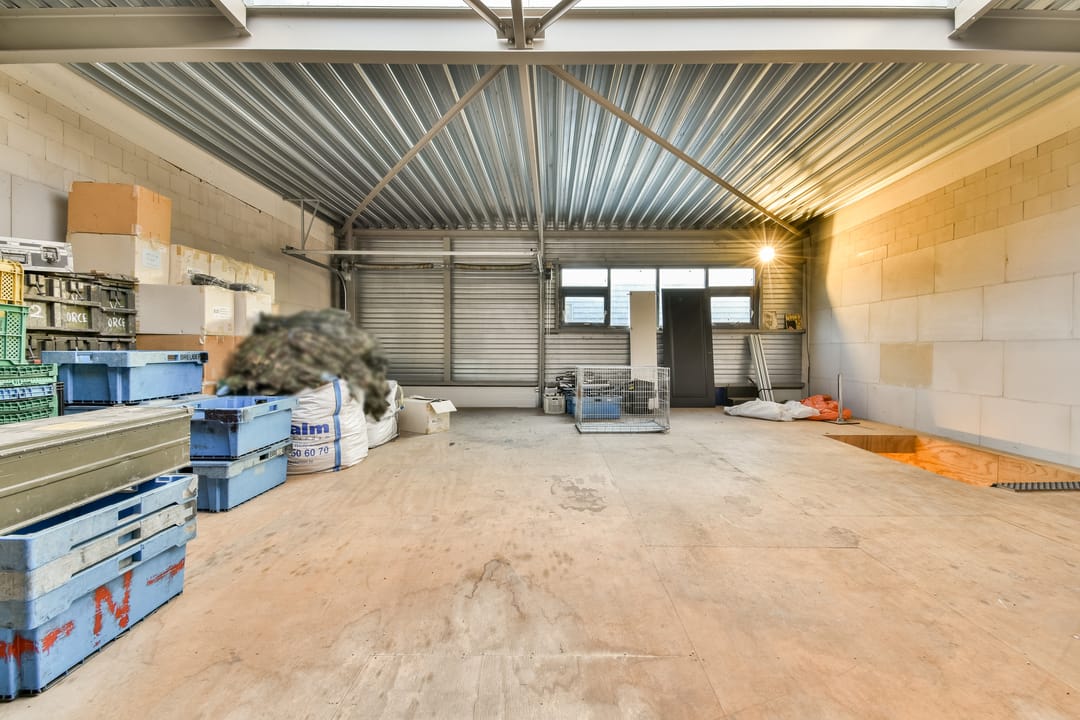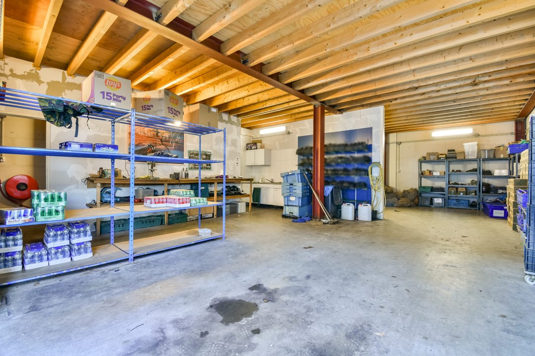 Aan de voorkant bevinden zich zowel een voor- als een overheaddeur. Deze geven toegang tot een ruime hal met een meterkast, vaste trap naar eerste verdieping, toiletruimte en een bedrijfsruimte met open keuken.