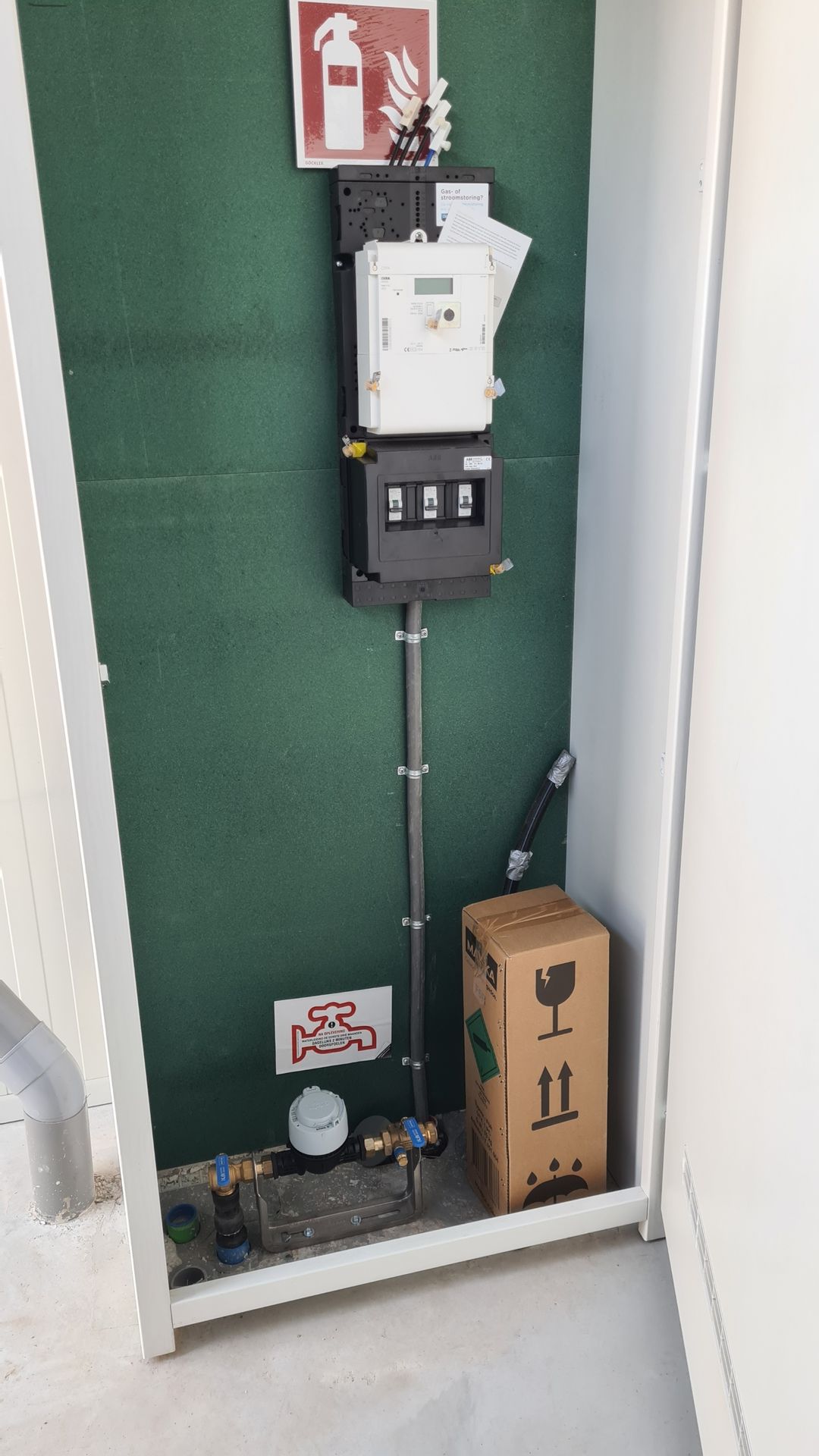 De meterkast is afgewerkt met multiplex, geheel volgens de geldende eisen van de nutsbedrijven. In de meterkast worden voor het storten van de betonvloer invoerbochten aangebracht t.b.v. elektriciteit, water, data-aansluiting; geheel volgens de geldende eisen van de nutsbedrijven. De stalen onderdelen van de hoofddraagconstructie zijn waar nodig volgens voorschriften van de brandweer brandwerend bekleed.
