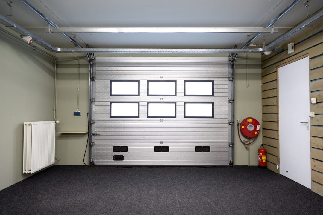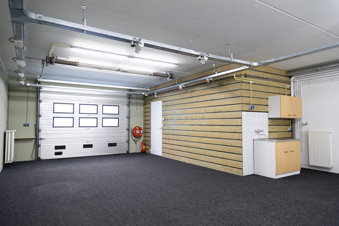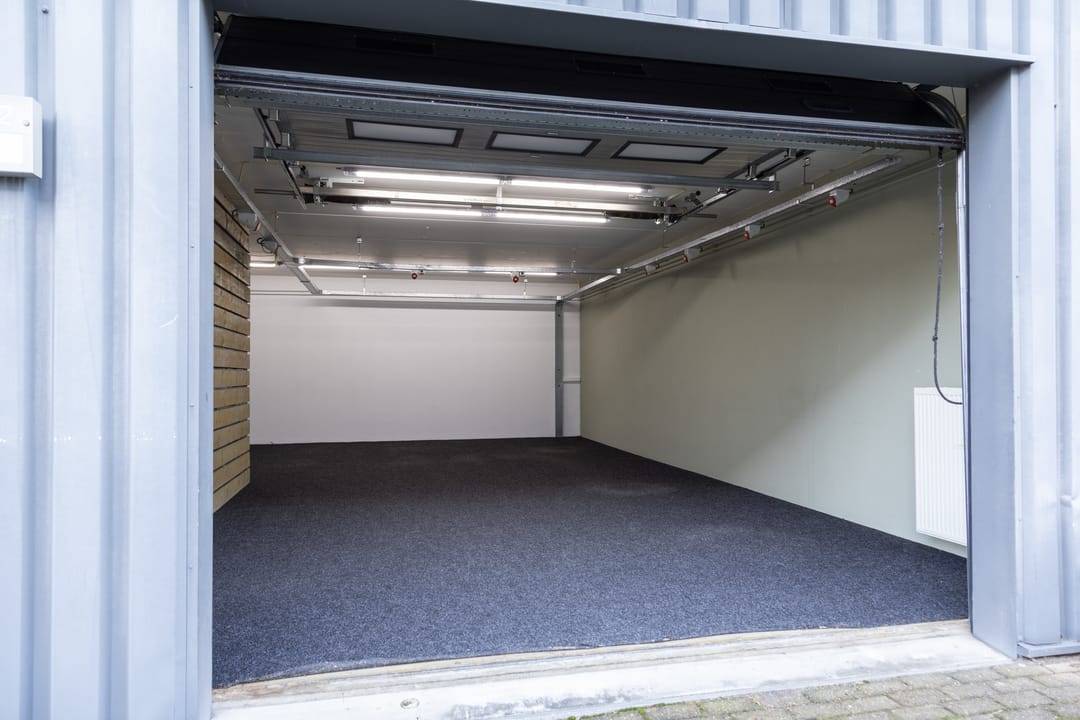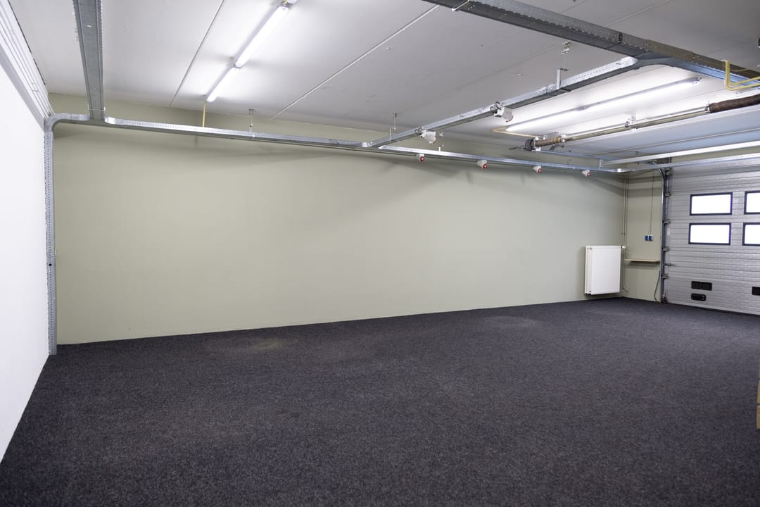 - Overheaddeuren, betonvloer, toilet, pantry, airconditioning, inbouwarmaturen en te openen ramen