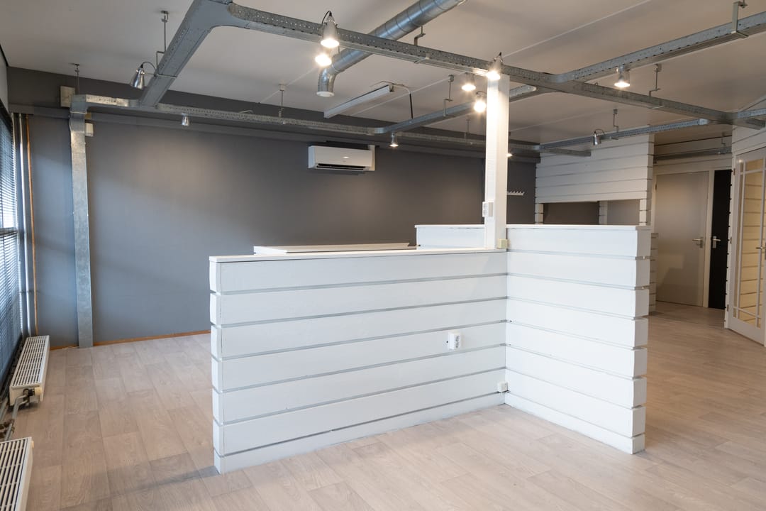 Ruim open kantoorvertrek geschikt voor meerdere werkplekken, vergaderkamer (afsluitbaar) keuken en kastenwand met C.V.-opstelling en bergruimte. De verdieping is voorzien van een airco unit.