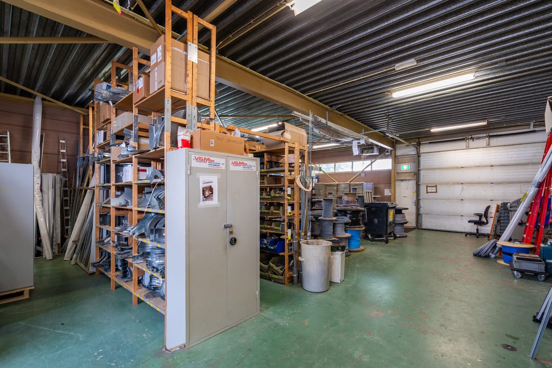 - Overheaddeuren, betonvloer, heater, toilet, pantry, airconditioning, inbouwarmaturen en te openen ramen