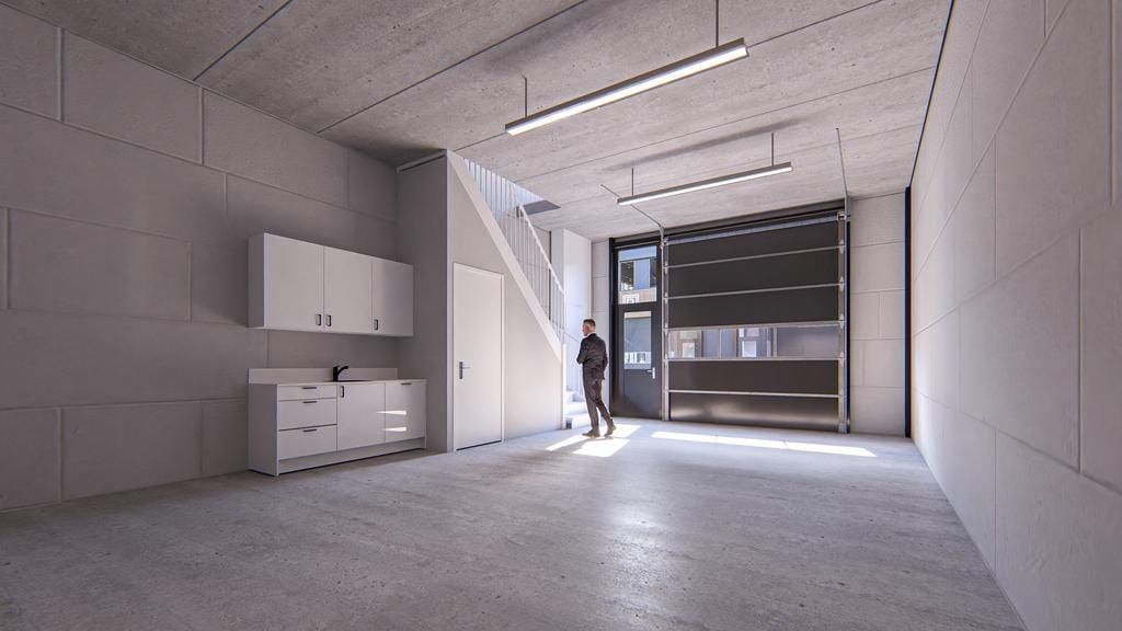 - Overheaddeuren, betonvloer, toilet en pantry