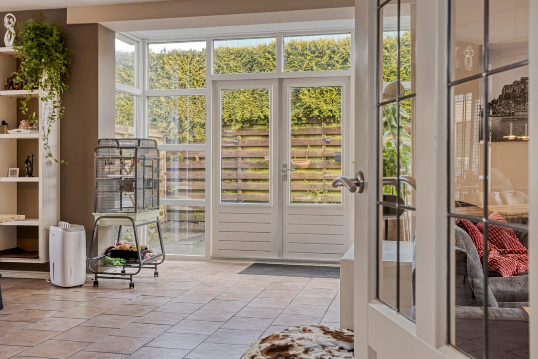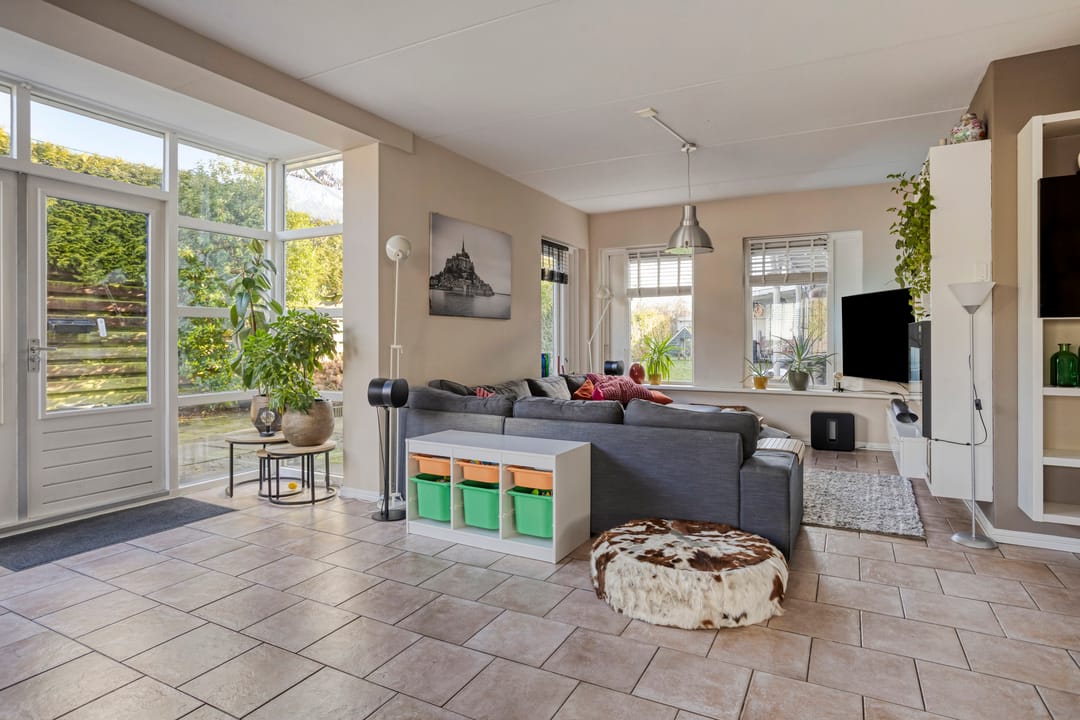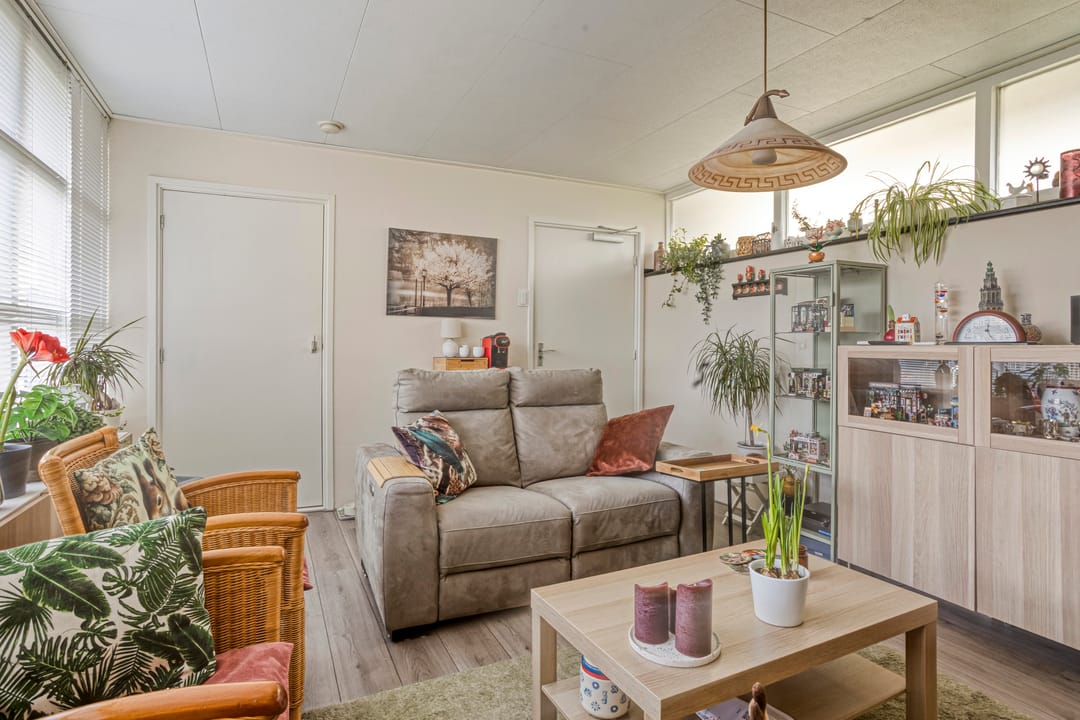 Begane grond: zijentree met meterkast, woonkamer met plavuizen vloer en erker voorzien van terrasdeuren, open keuken met ruime hoekopstelling voorzien van gasfornuis, afzuigkap, vaatwasser en combimagnetron, hal met stookruimte en bijkeuken, tussenkamer met eigen portaal en 1 ruime slaapkamer.