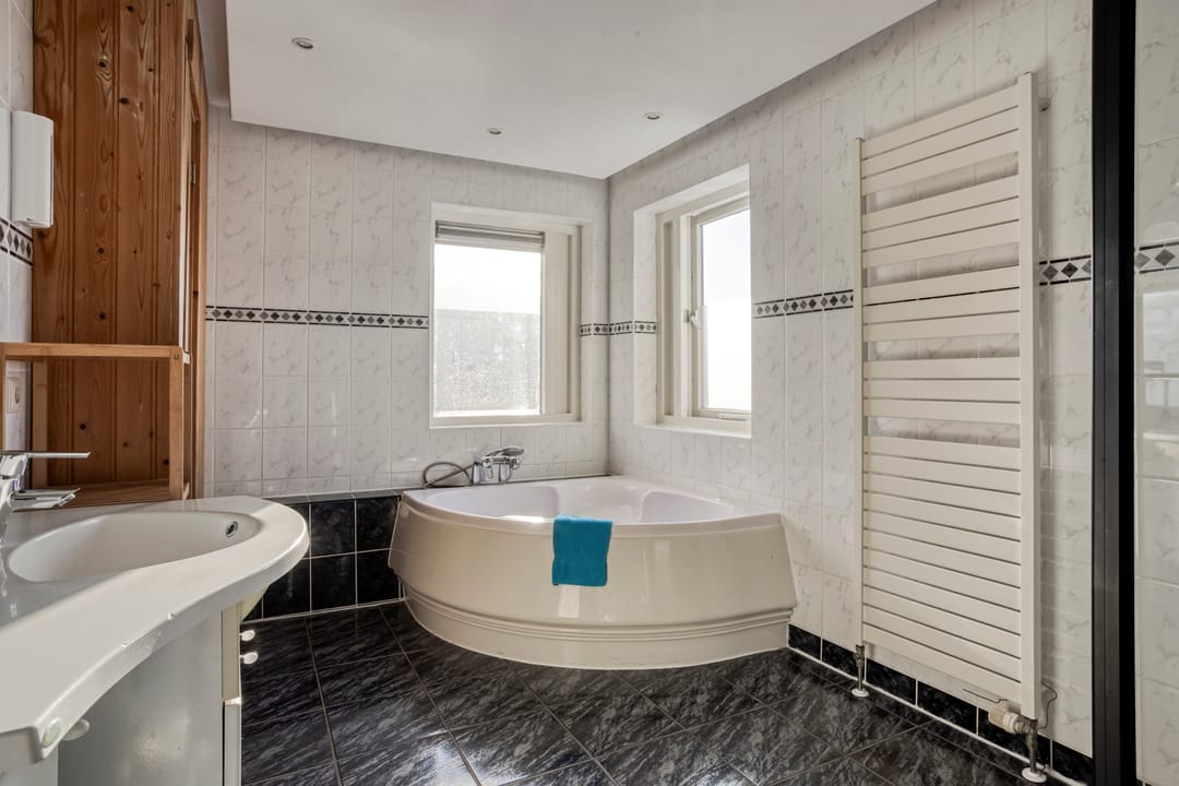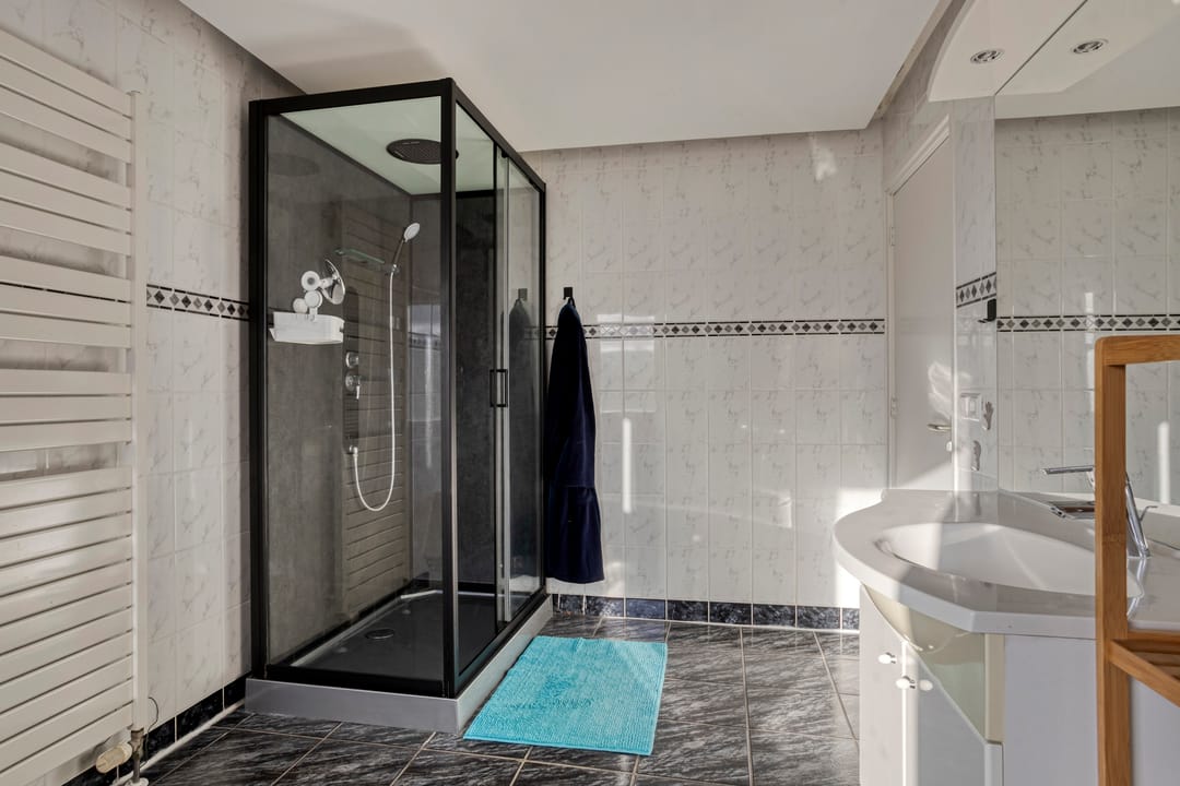 1e etage: overloop, 3 ruime slaapkamers en badkamer met ligbad, douchehoek, wastafel met meubel en inbouwkast bestemd voor sauna.