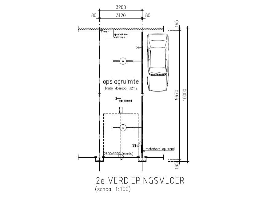 - elektrische overheaddeur (2,60 m breed en 3,20 m hoog) met loopdeur en afstandsbediening;