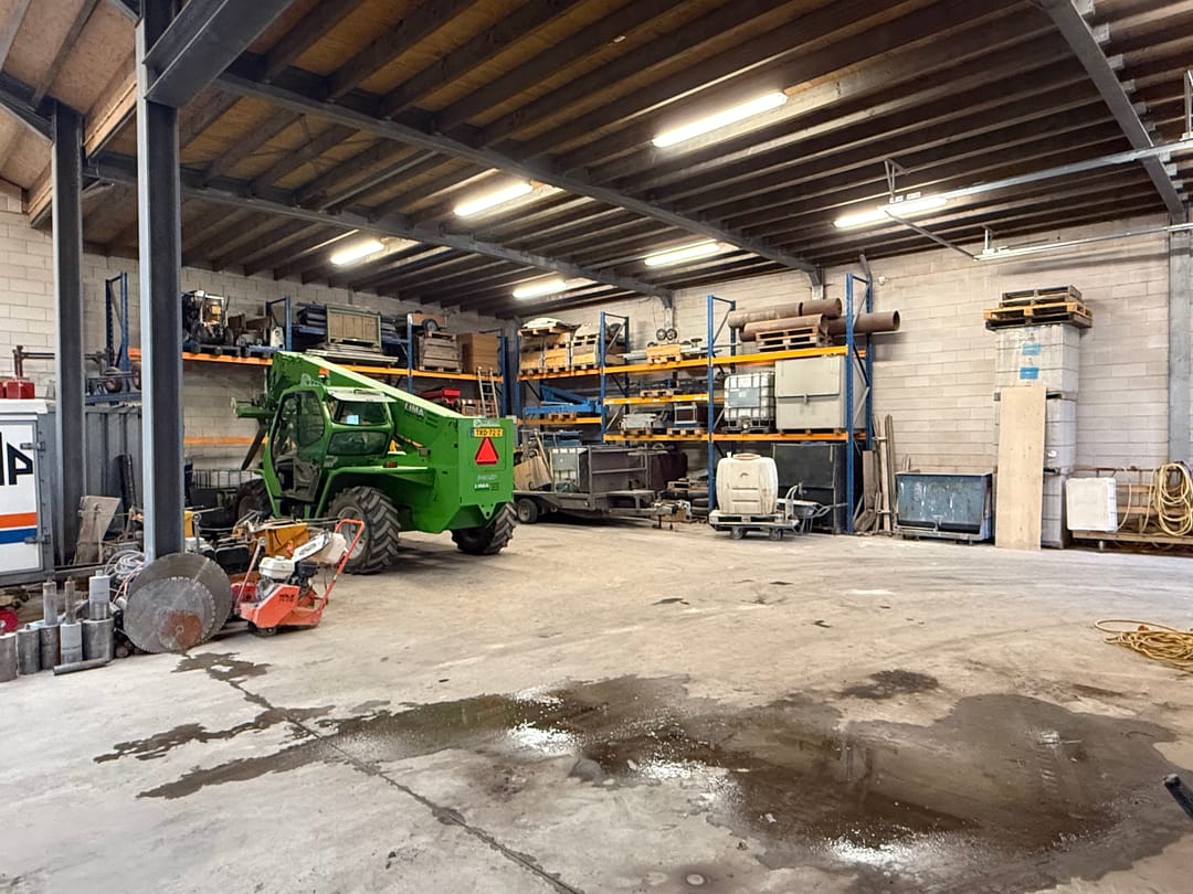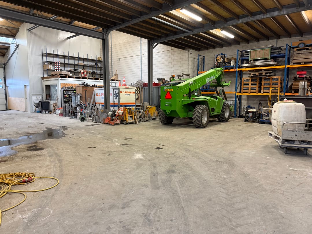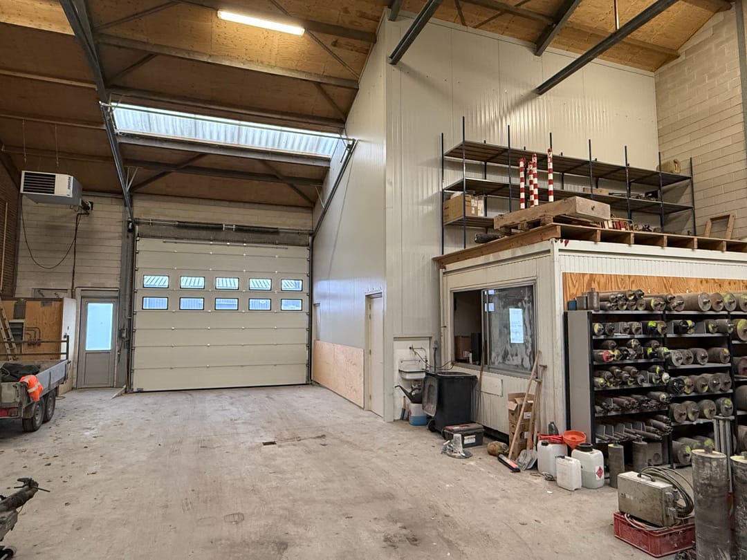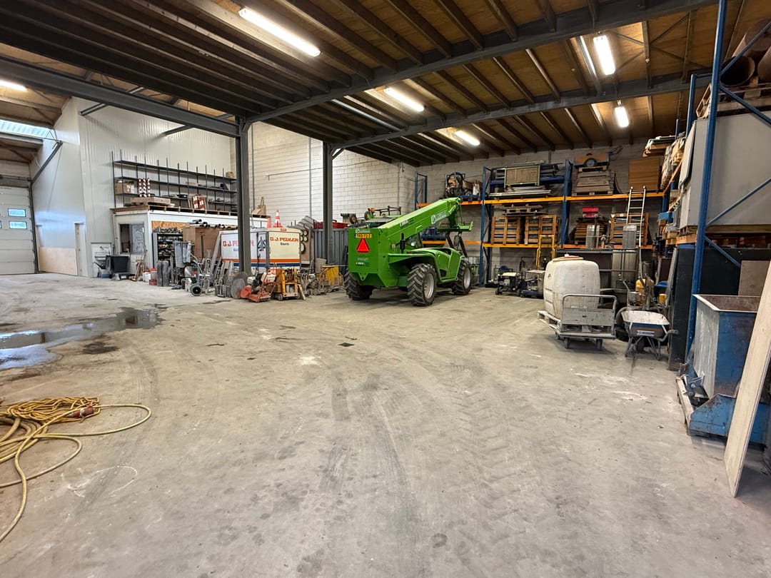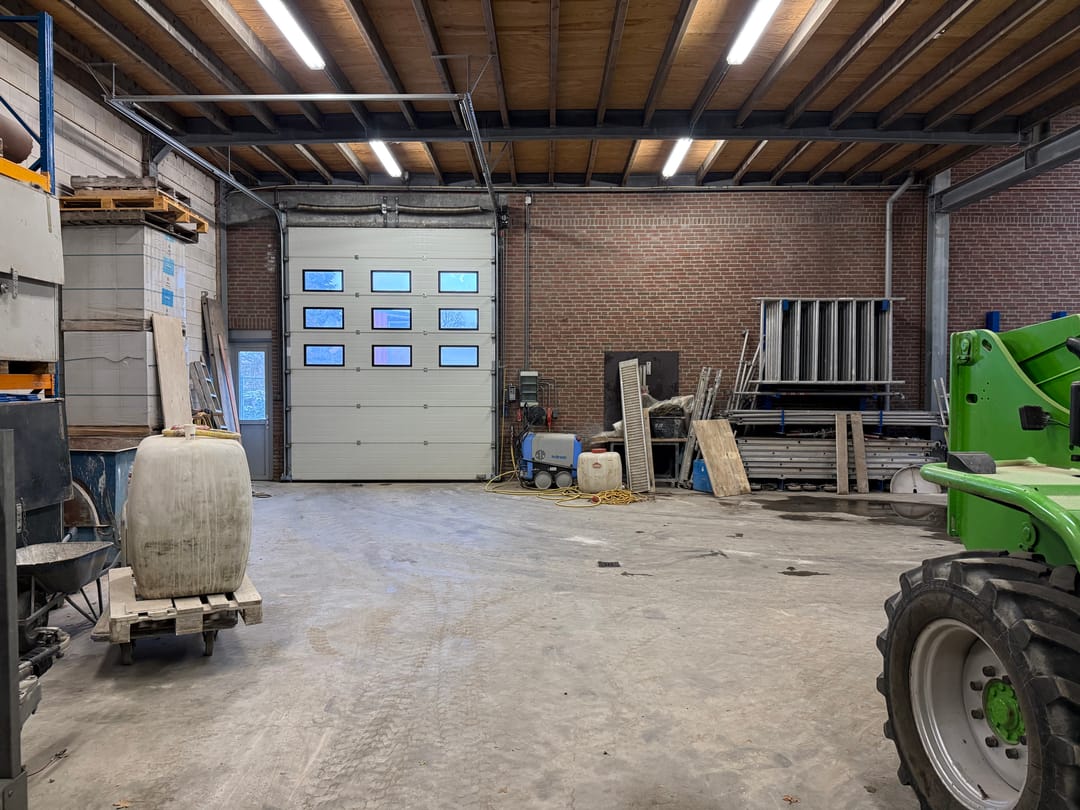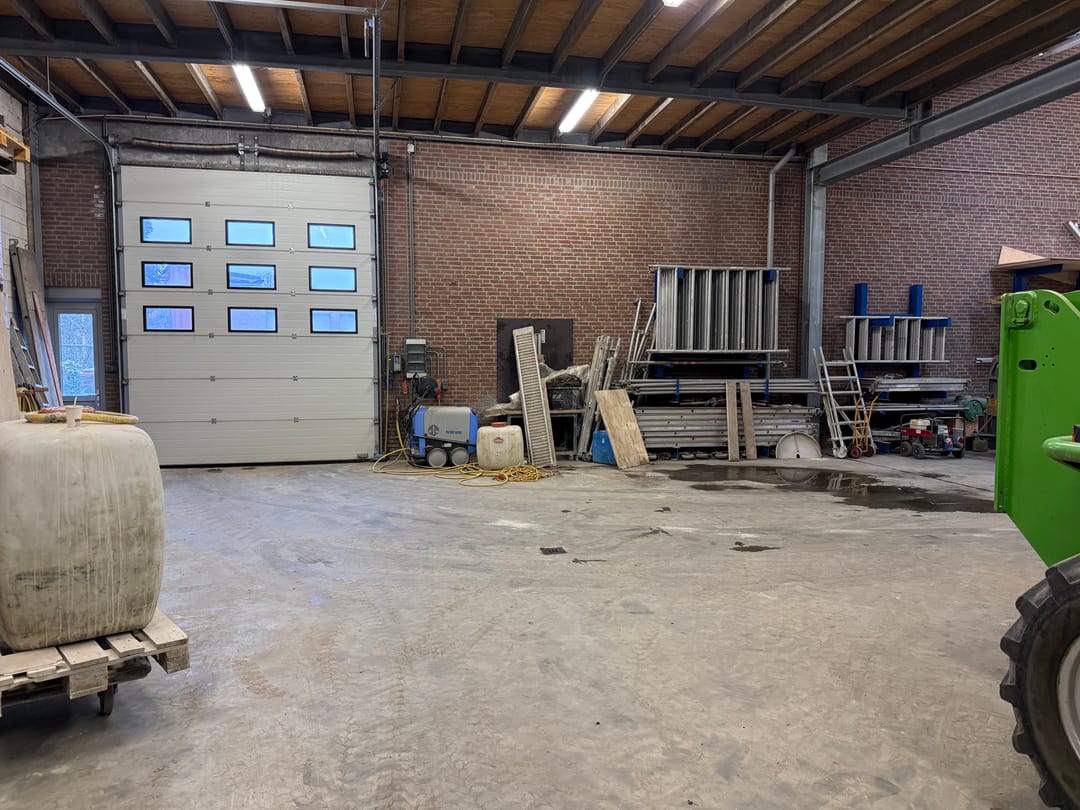 - Overheaddeuren, krachtstroom, betonvloer, heater en toilet