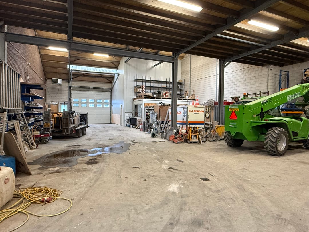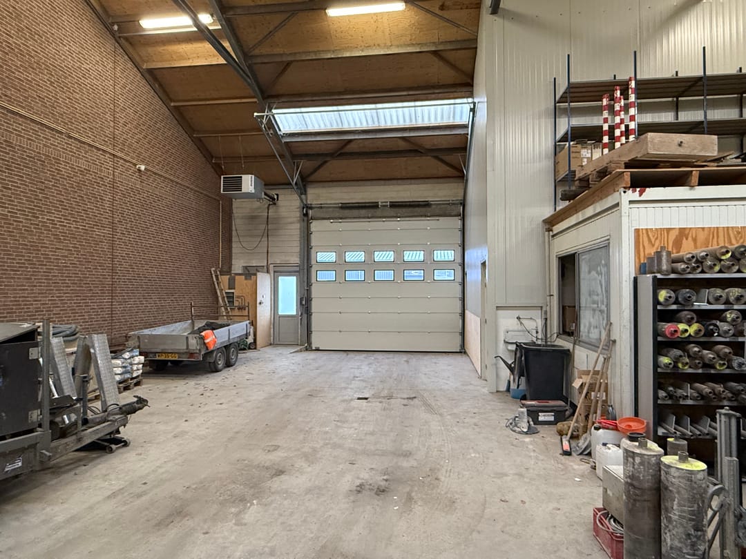 De aangebonden bedrijfsruimte bestaat uit een grote opslag/bedrijfsruimte van ca. 424 m². Aan de voorzijde toegankelijk middels een grote rolpoort met een doorrijhoogte van 4,25 meter en een aparte loopdeur.