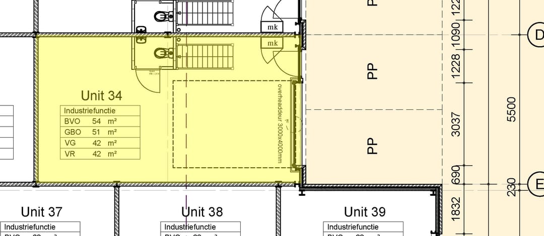 - Overheaddeuren, betonvloer, toilet, pantry, airconditioning, inbouwarmaturen en te openen ramen