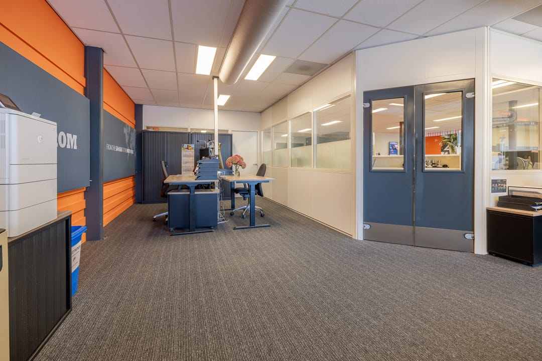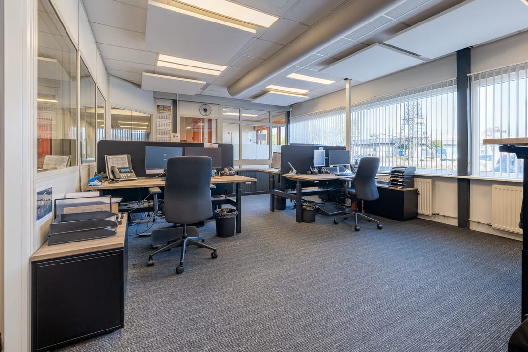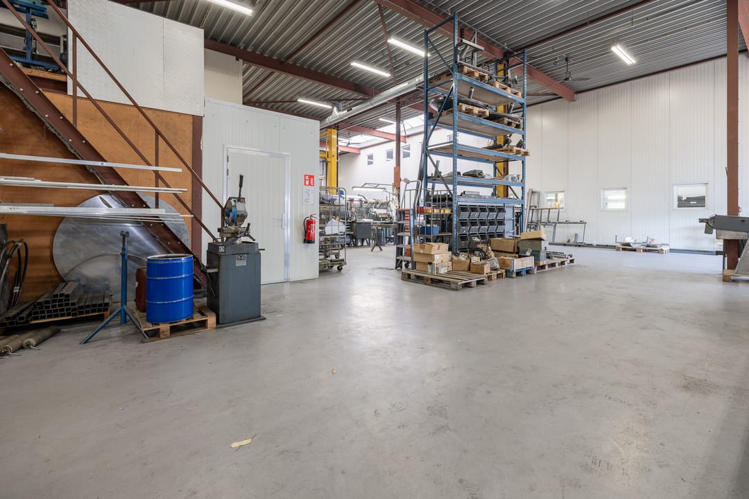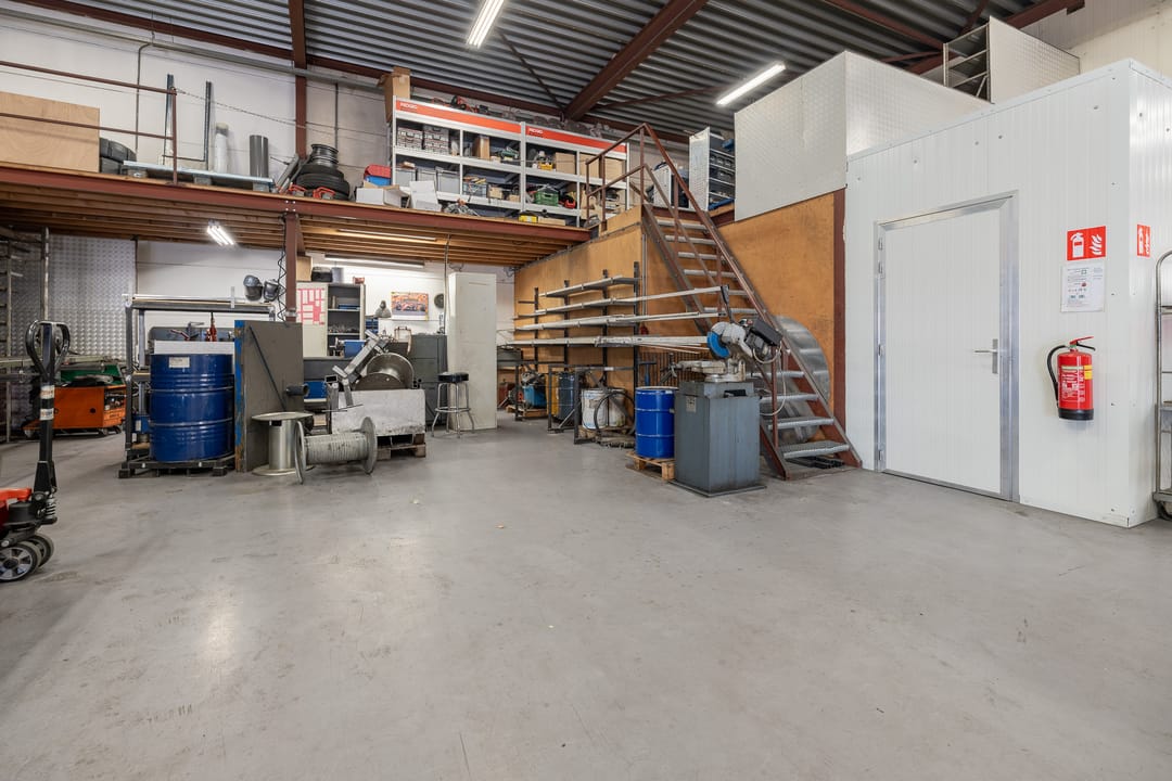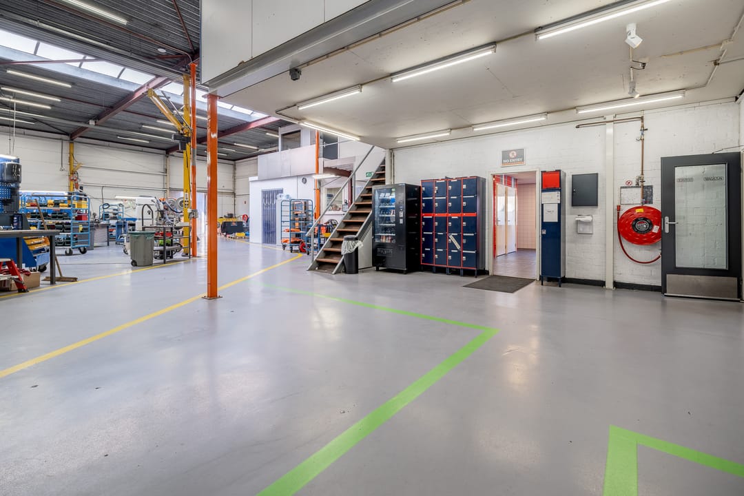 Achter het kantoor ligt de grote bedrijfsruimte/werkplaats gesplitst in meerdere afdelingen. Ook zijn er sanitaire voorzieningen, een pantry en een archief aanwezig. Op de verdieping bevinden zich extra kantoren en een kantine.