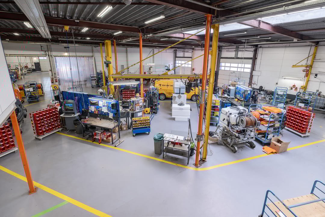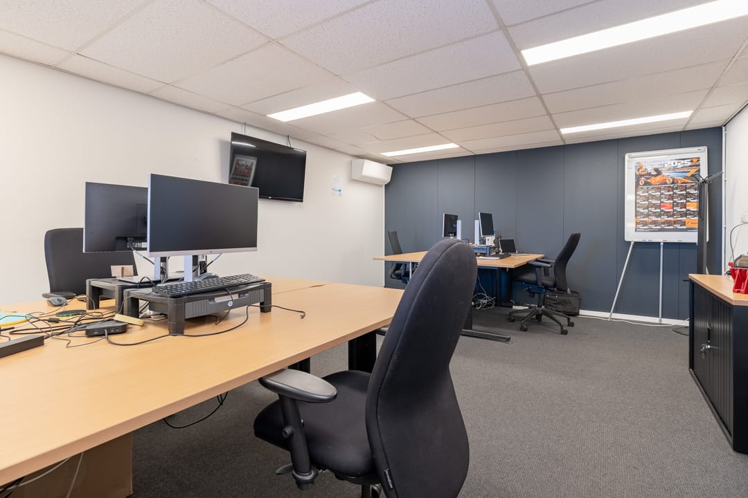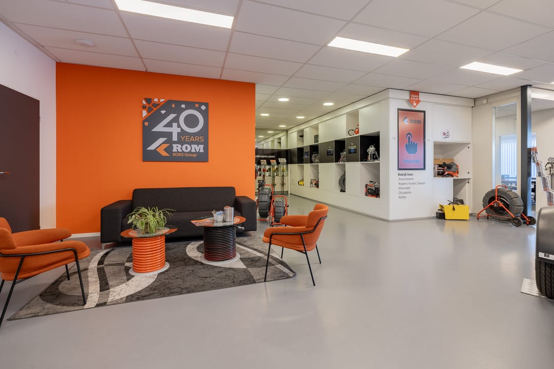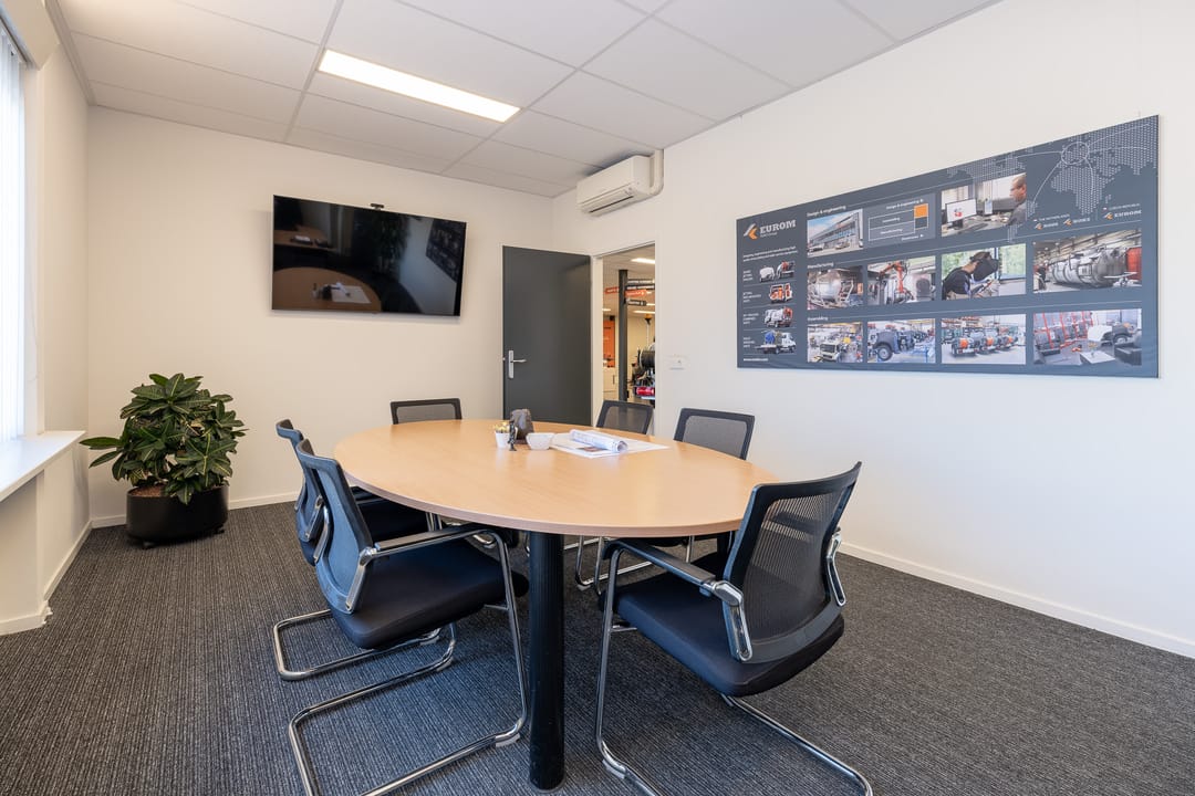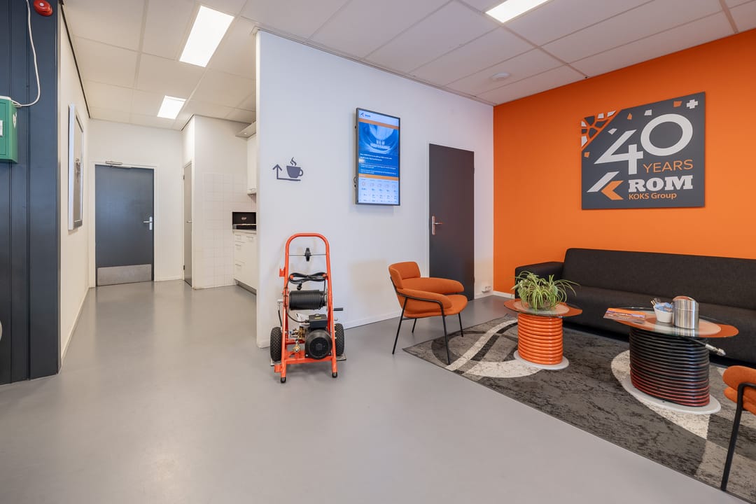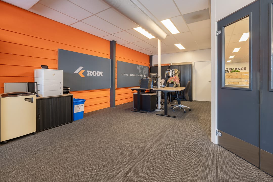 Achter het kantoor ligt de grote bedrijfsruimte/werkplaats gesplitst in meerdere afdelingen. Ook zijn er sanitaire voorzieningen, een pantry en een archief aanwezig. Op de verdieping bevinden zich extra kantoren en een kantine.
