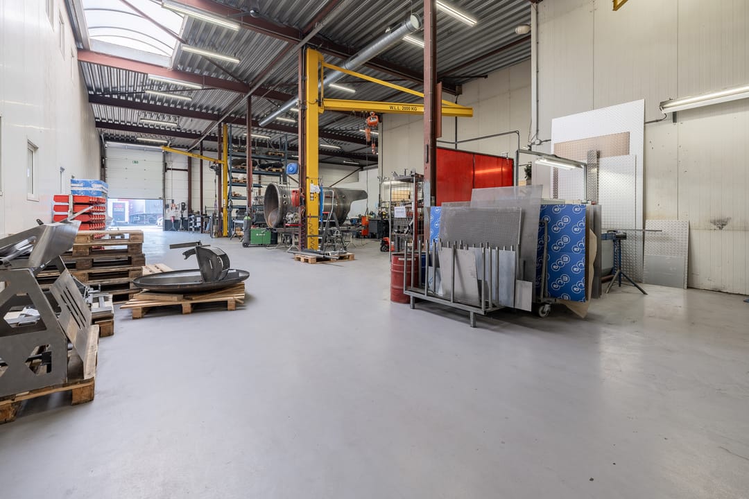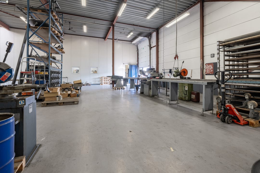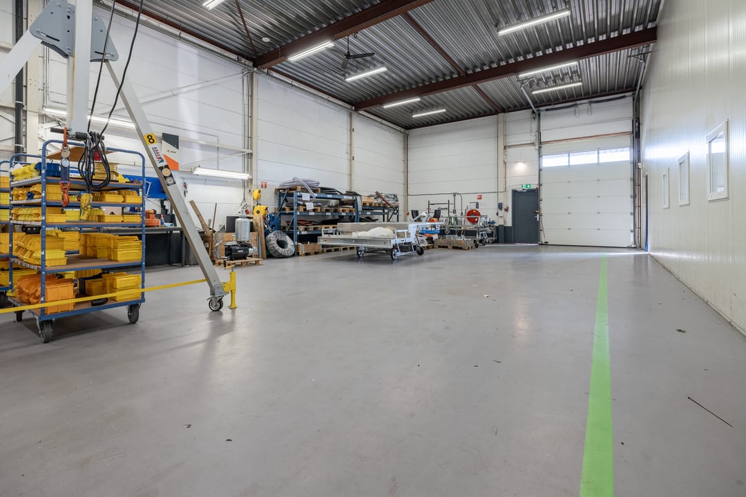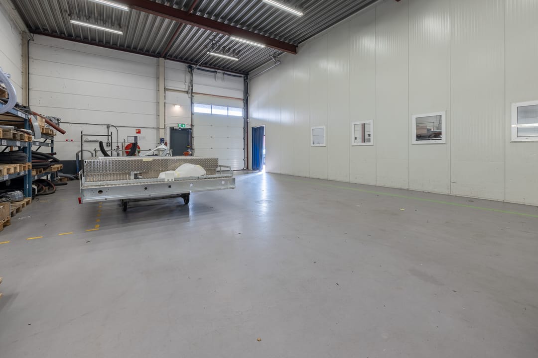 • Bedrijfsruimte: Polyurethaan gietvloer (2020), diverse overheaddeuren, lichtstraat, cv gestookte heater en twee gasheaters.