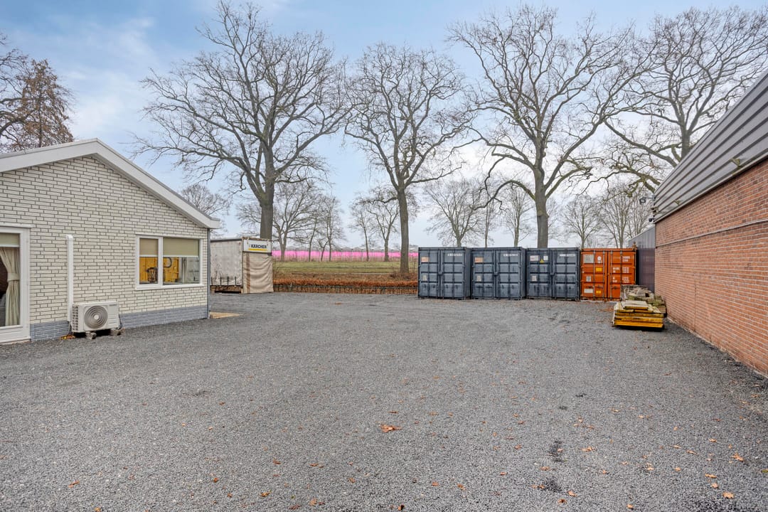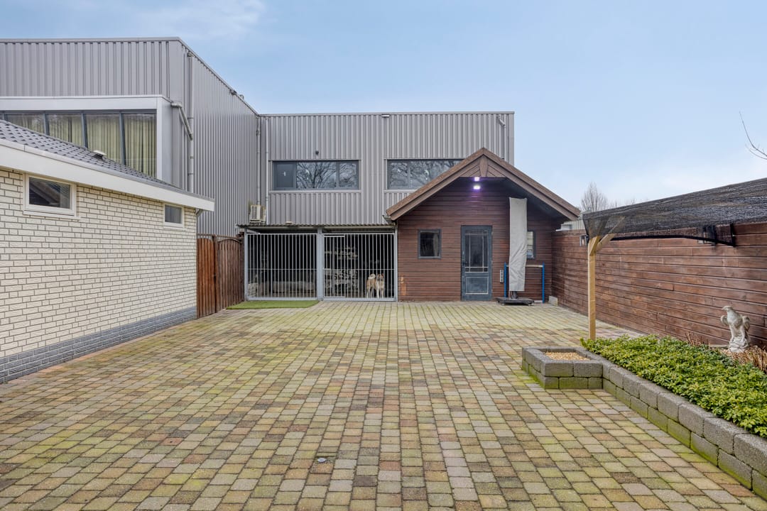 Tussen de woning en de bedrijfsruimte bevindt zich een kleine externe berging met onder andere de compressor voor de persluchtinstallatie.