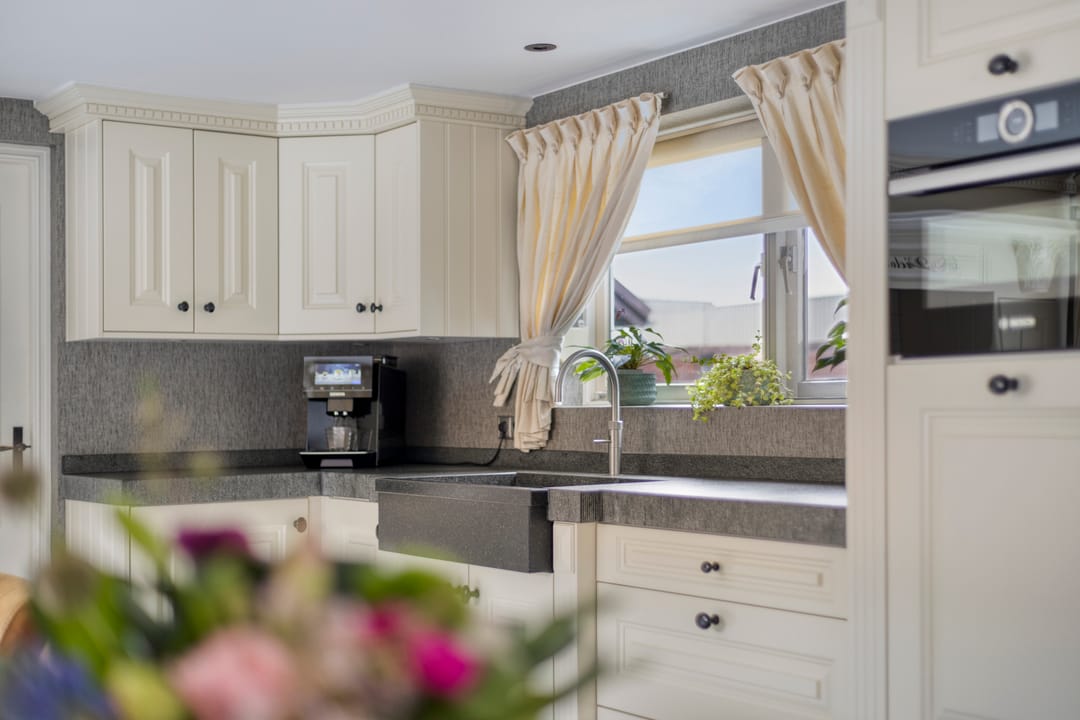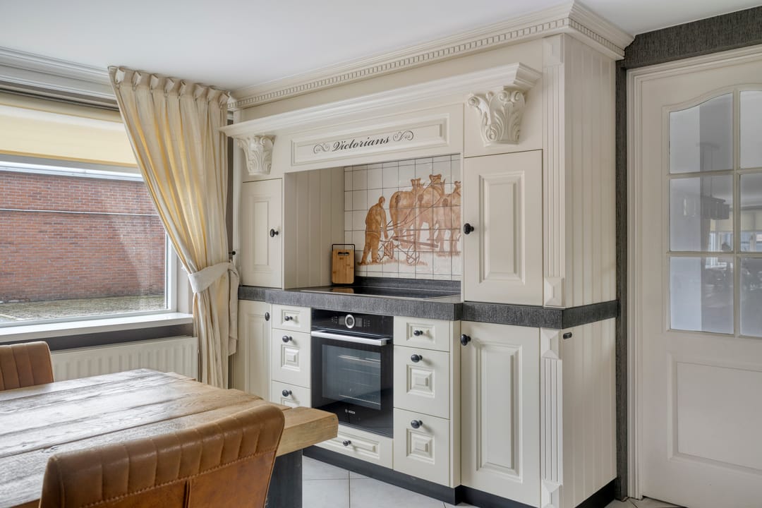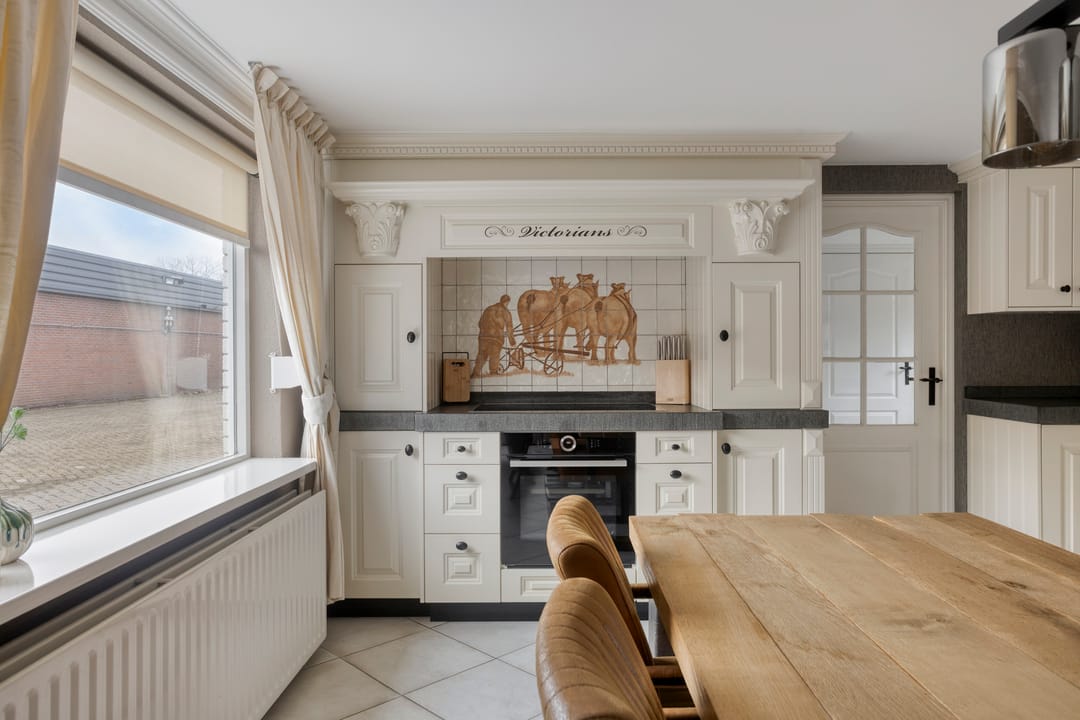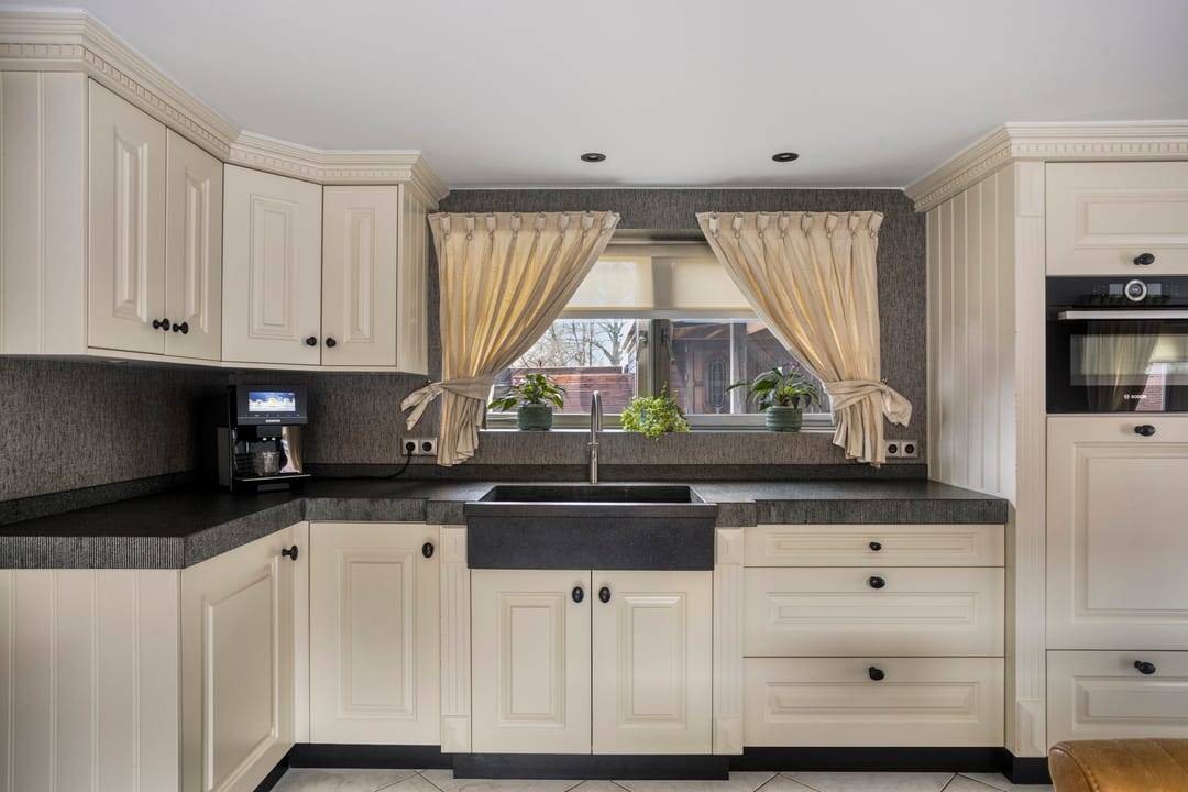 De landelijke keuken is compleet uitgevoerd met een natuurstenen werkblad en een Quooker voor direct heet water. Verder beschikt de keuken over een 5-pits inductiekookplaat, combi-oven, separate (ongebruikte) stoomoven, koelkast, vriezer en vaatwasser. De vele opbergmogelijkheden, waaronder praktische apothekerskasten, maken de keuken niet alleen stijlvol maar ook functioneel.