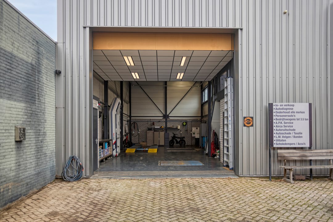 • Vier krachtstroomaansluitingen - Ringleiding voor perslucht met diverse aansluitingen - Uitstortgootsteen - Twee hefbruggen en één speciale brug voor aanhangers - Meterkast waarin ook de elektra van de woning binnenkomt - Veel daglicht dankzij hooggeplaatste draai-/kantelramen
