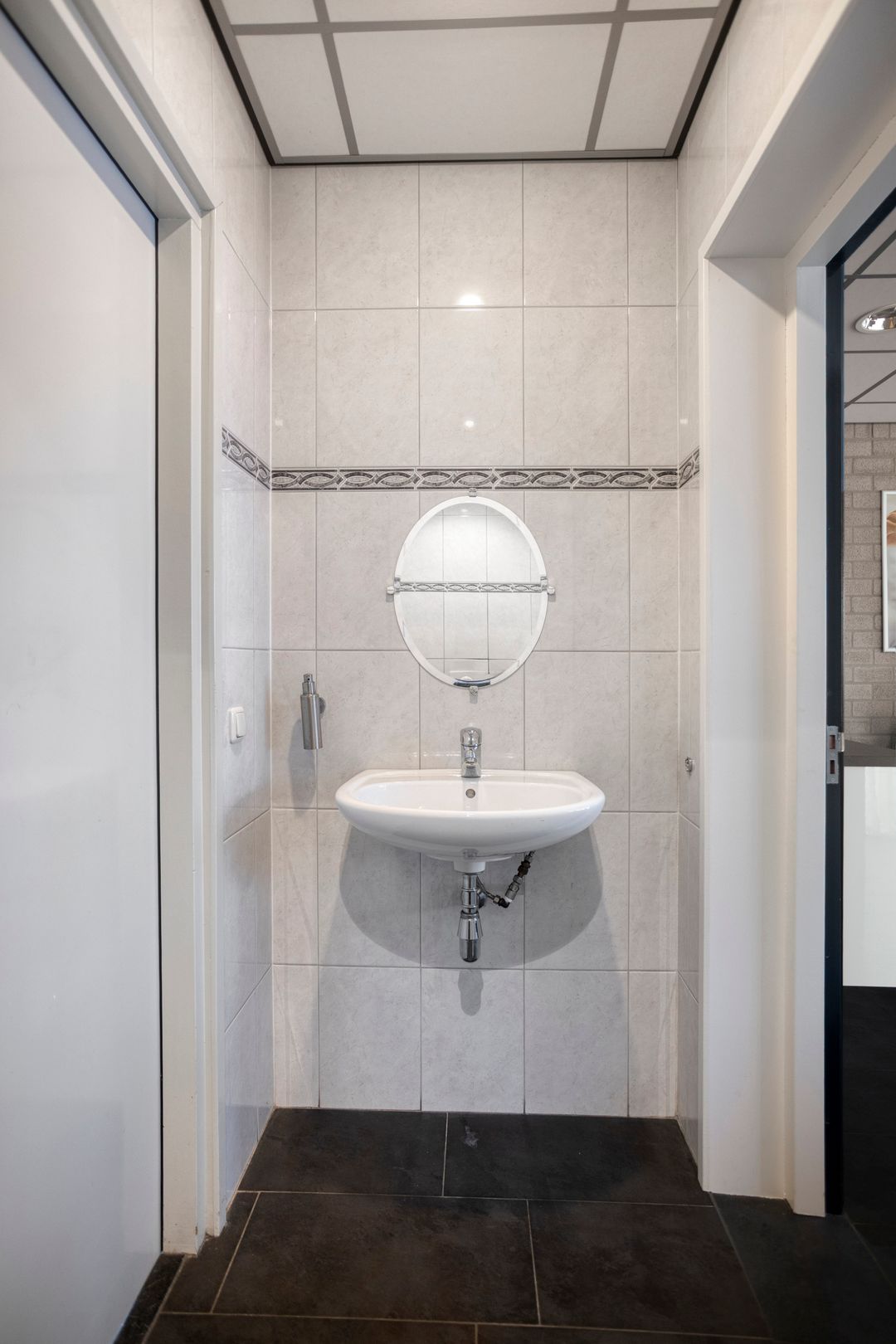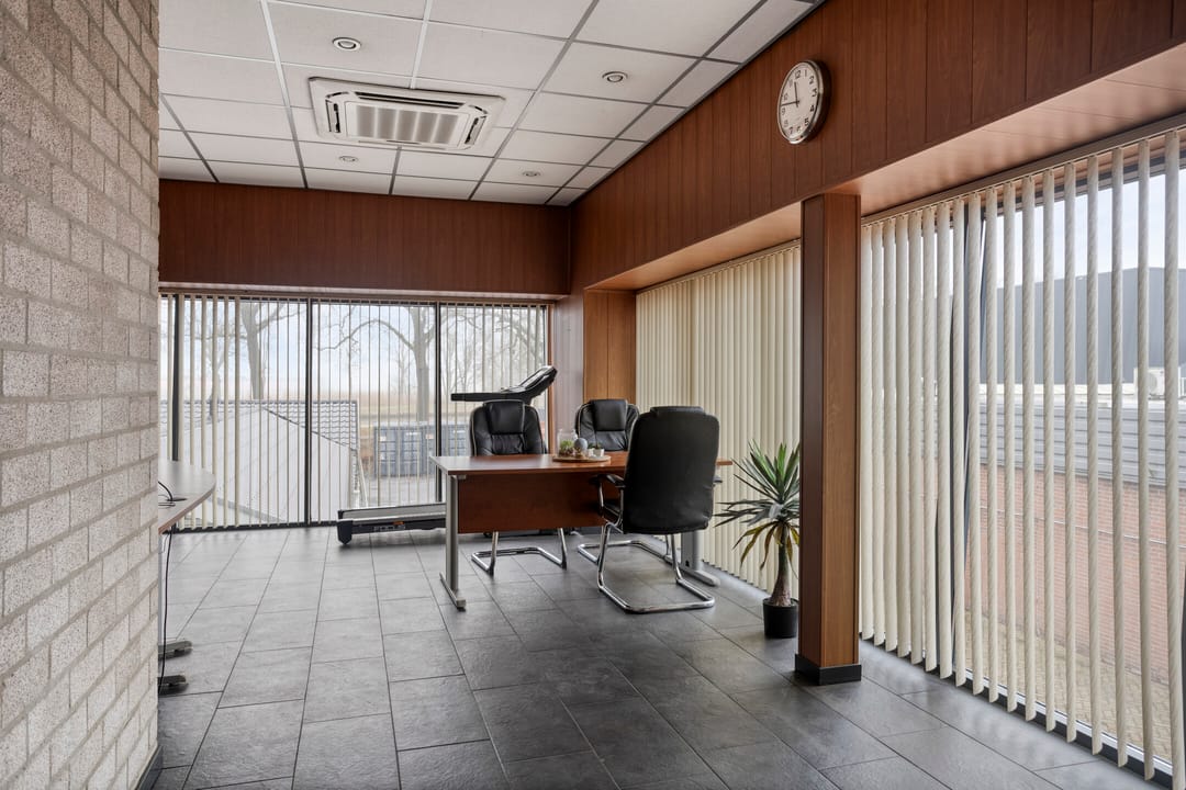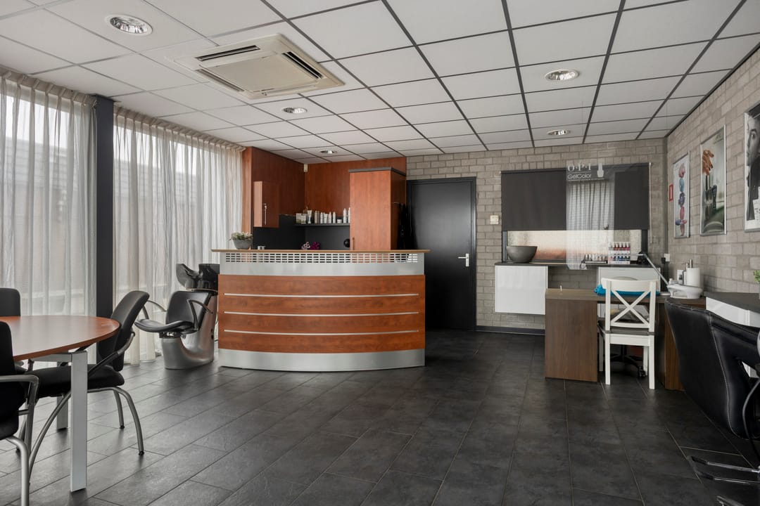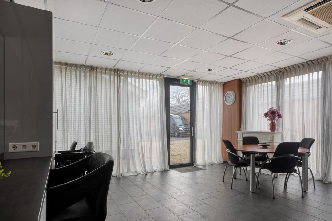 Met de mogelijkheid tot het realiseren van een volledige verdiepingsvloer biedt de hal bovendien extra uitbreidingspotentieel. De kantoorruimten zijn verdeeld over twee etages en afgewerkt met moderne glazen puien. Het kantoor op de begane grond (momenteel in gebruik als salon) beschikt over een eigen entree, airconditioning (koelen en verwarmen) en toilet. Ook het kantoor op de eerste verdieping is licht, ruim en voorzien van airconditioning, inbouwkasten en een fraai uitzicht op het kanaal. Op de verdieping bevinden zich daarnaast een kantine met keukenblok, een grote afgesloten berging op de entresol en een technische ruimte met onder andere een warmwaterboiler. De bedrijfsruimte is tevens voorzien van een alarminstallatie en glasvezelaansluiting.