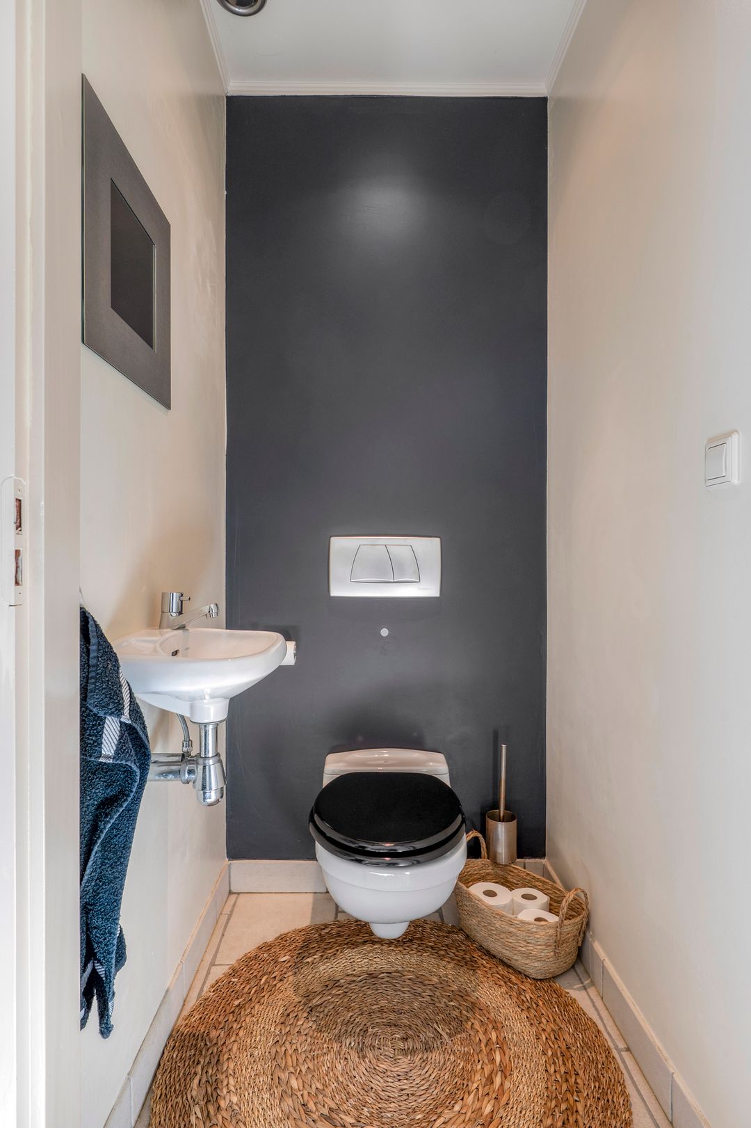 • Entree/hal met tegelvloer, meterkast en modern toilet met zwevend closet en fonteintje