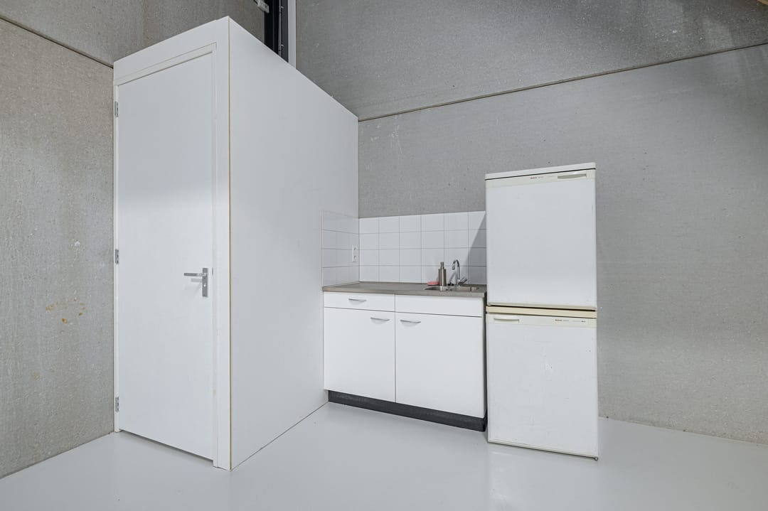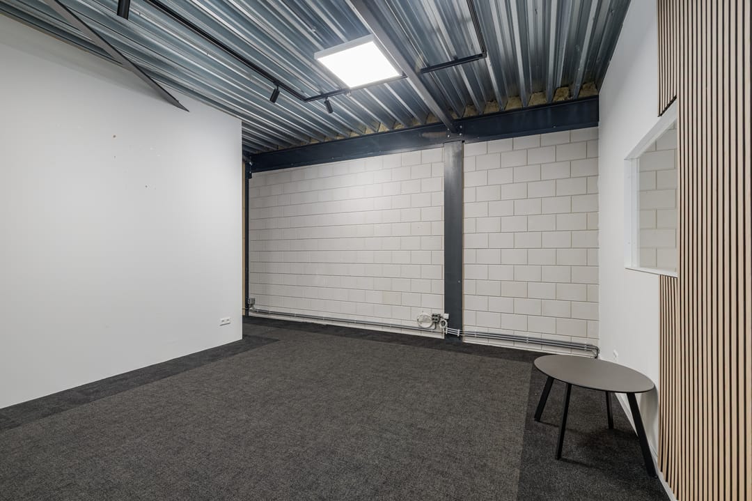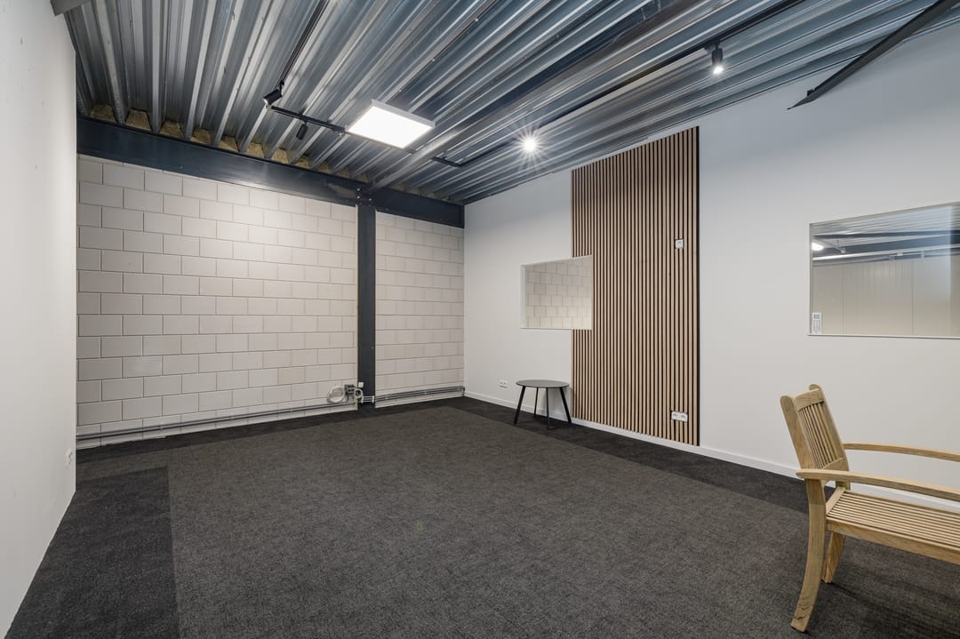 De nette kantoorruimte meet ca. 31m2 (VVO) en ligt aan de achterzijde van de bedrijfshal. Bereikbaar middels een stalen trap vanuit de hal. Keurig afgewerkt en voorzien van een airco-unit, ledverlichting en stopcontacten rondom. Vanuit het kantoor heb je zicht op de hal.