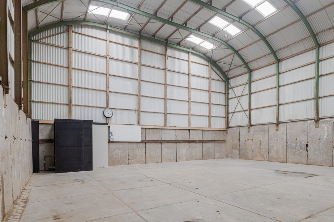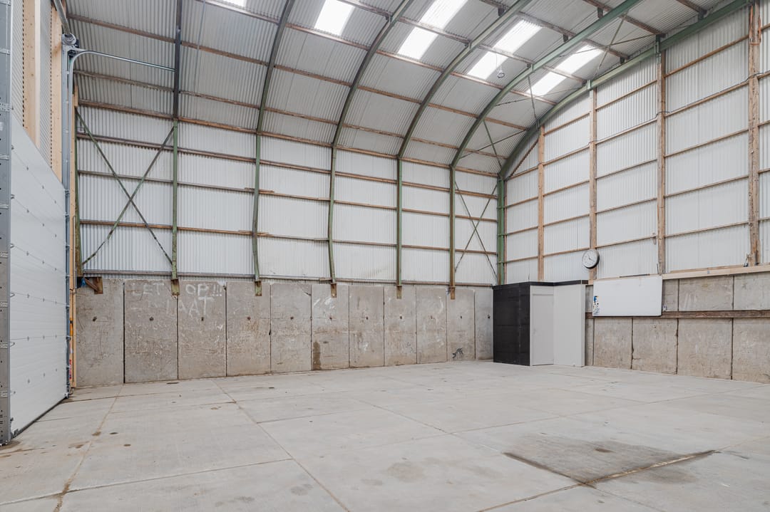 Binnenkomst via de twee loopdeuren of de twee elektrische overheaddeuren. De bedrijfshal is een open ruimte, links in de hoek tref je een toilet aan met een aparte uitstortgootsteen. De vrije hoogte van de hal betreft 6,60 meter. De gehele hal is voorzien van stelconplaten. Het terrein aan de voorzijde van de hal is afgesloten en is voorzien van stelconplaten.