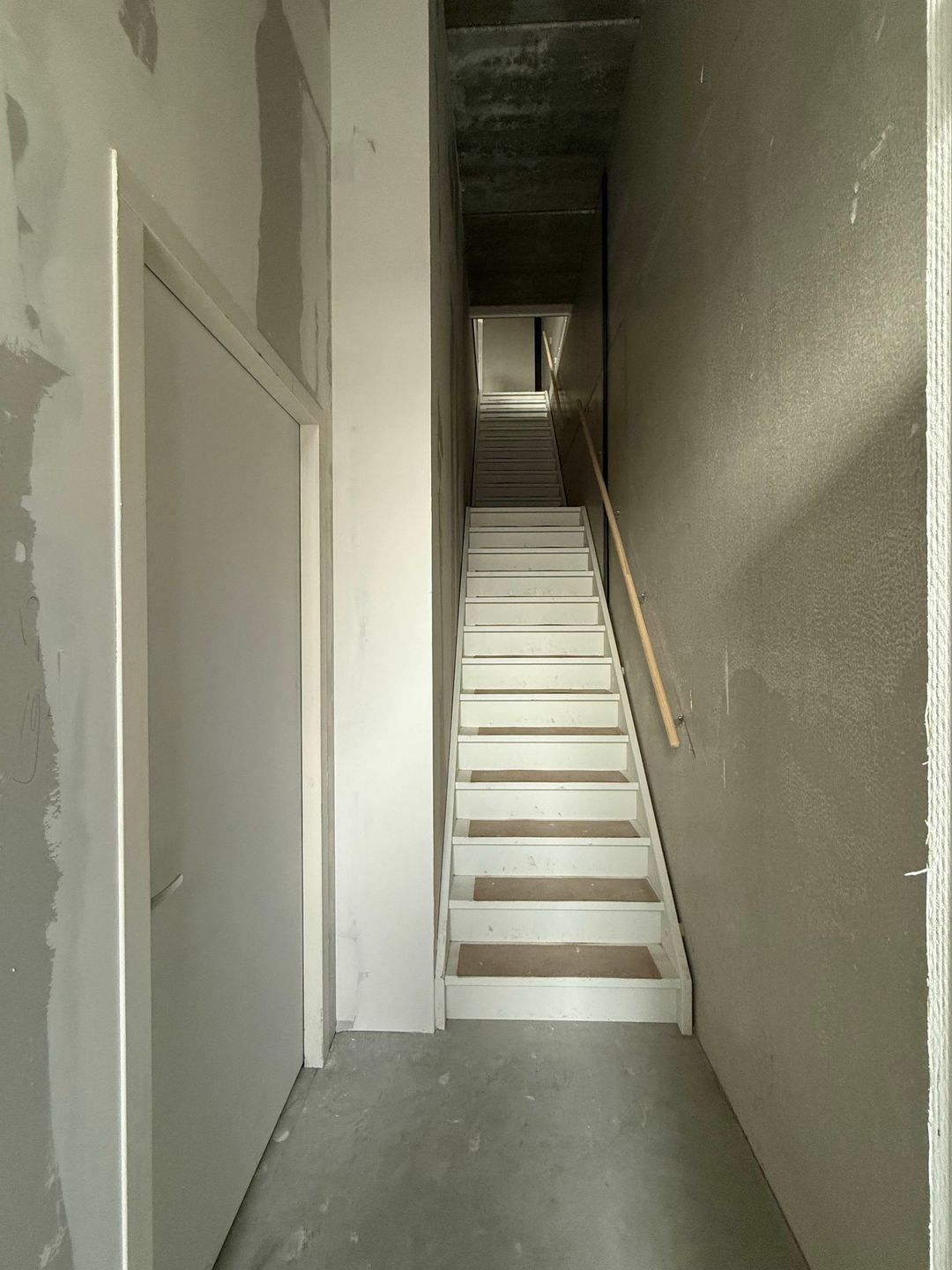 Entree, open bedrijfsruimte, trapopgang naar verdieping.