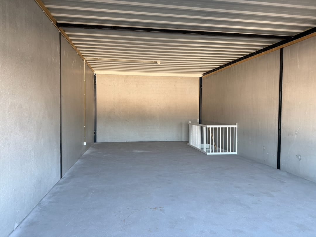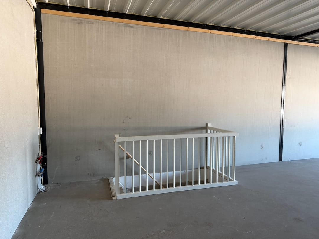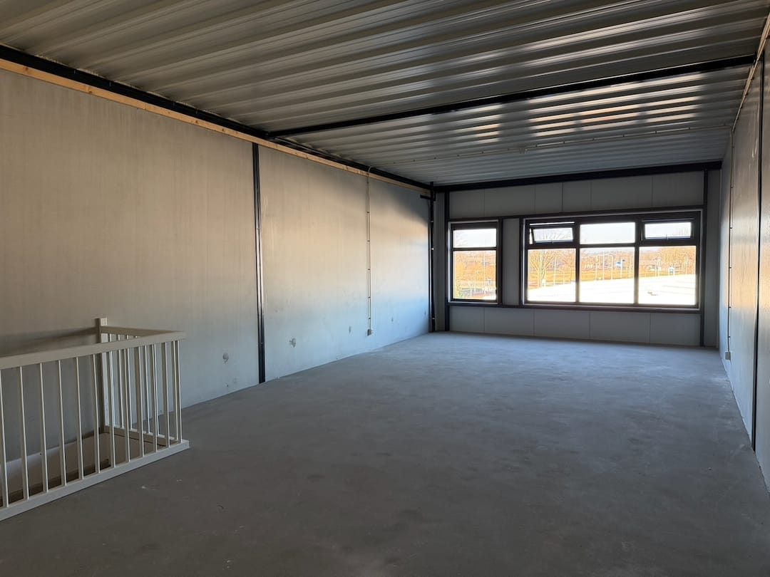 - Overheaddeuren, betonvloer, toilet, pantry en te openen ramen