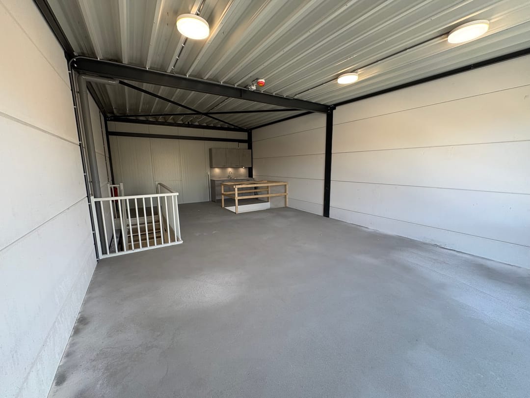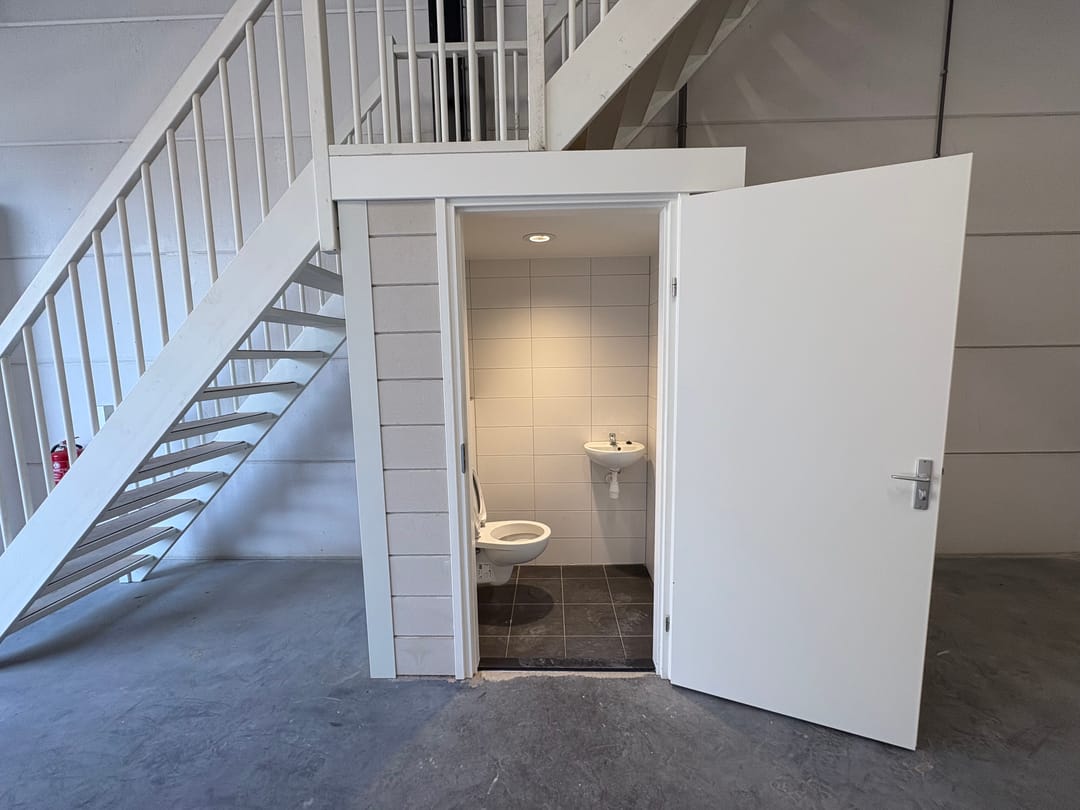 - Overheaddeuren, betonvloer, toilet en te openen ramen