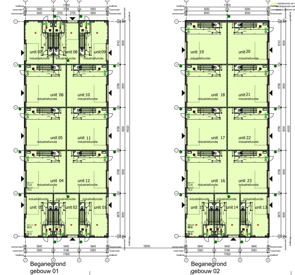 De bedrijfsunits variëren in bruto vloeroppervlakte van circa 152 m² tot 158 m² en zijn verdeeld over kop-, tussen- en eindunits.