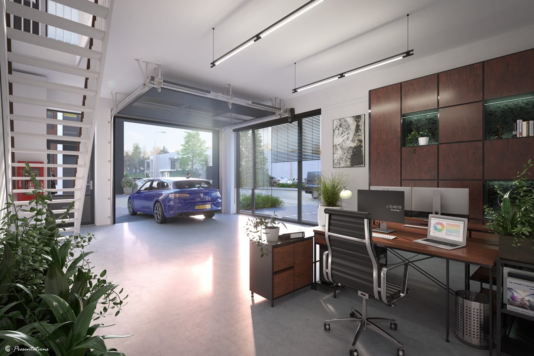 Tussen-/eindunits: praktische indeling, voorzien van een overheaddeur en ideaal als werk- of opslagruimte met kantoor op de verdieping.