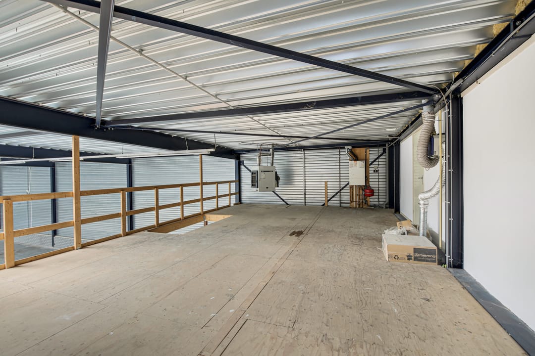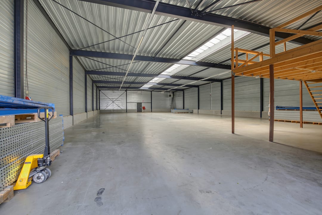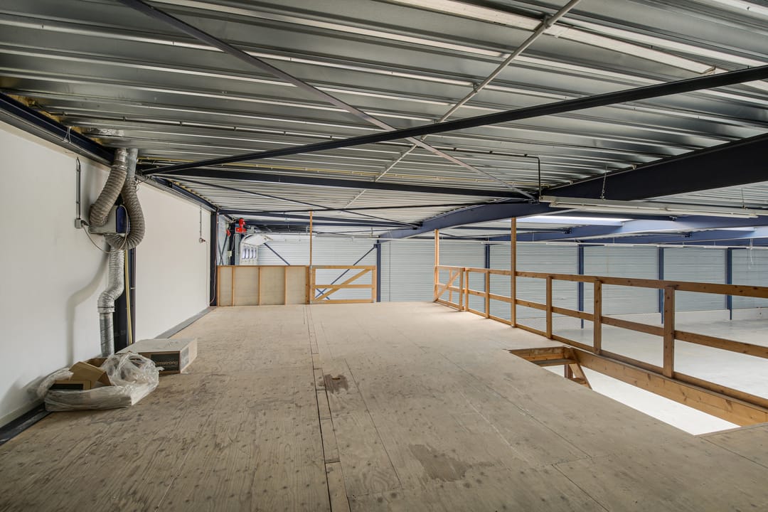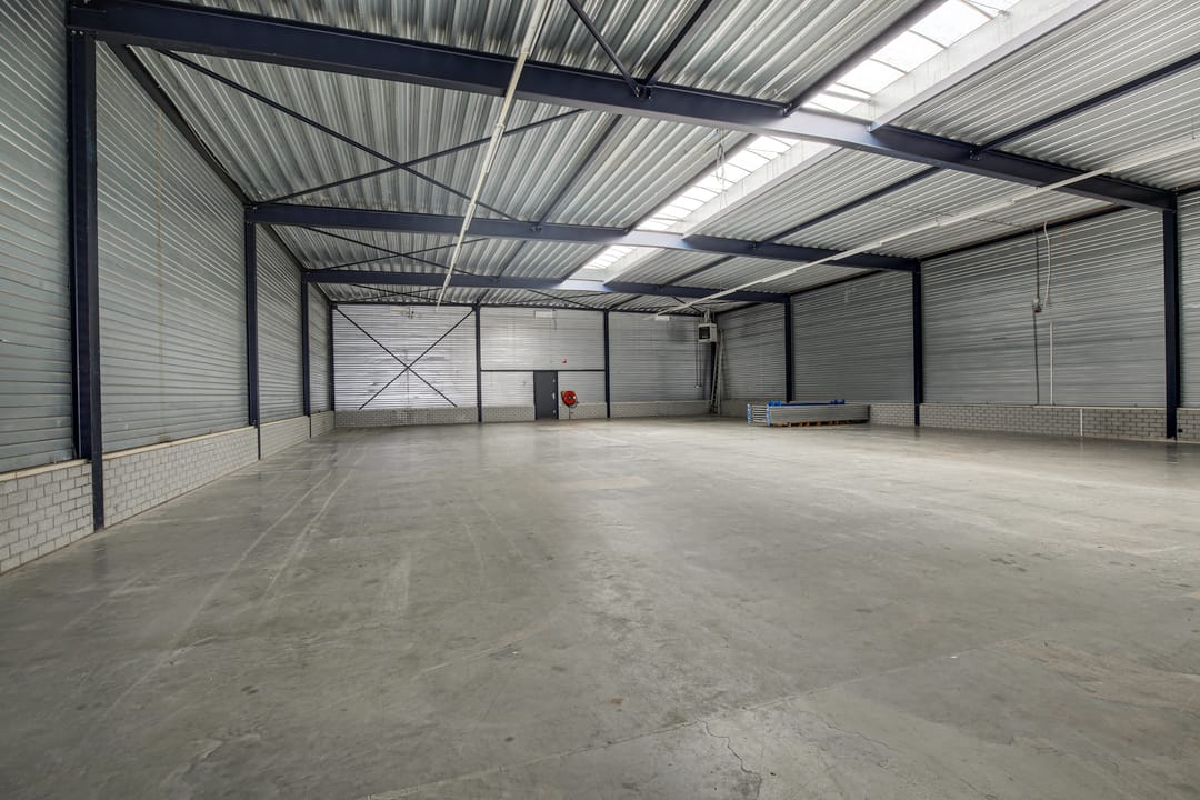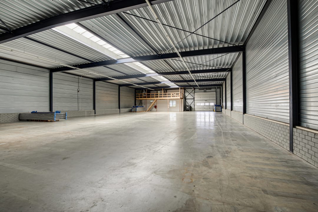 Bedrijfsruimte met heaters en elektrische overheaddeur.