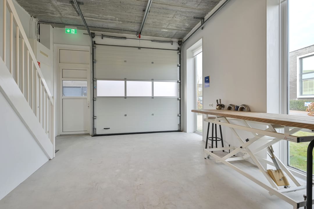 - Overheaddeuren, betonvloer, heater, toilet, pantry en te openen ramen