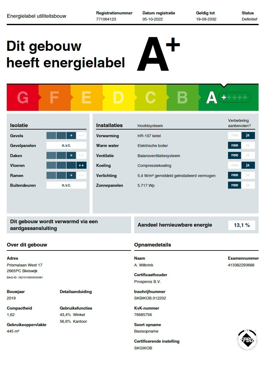 Energielabel: Het bedrijfspand heeft een energielabel A+.