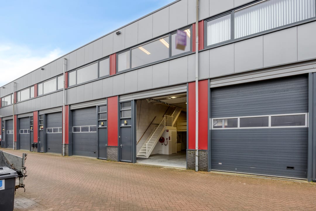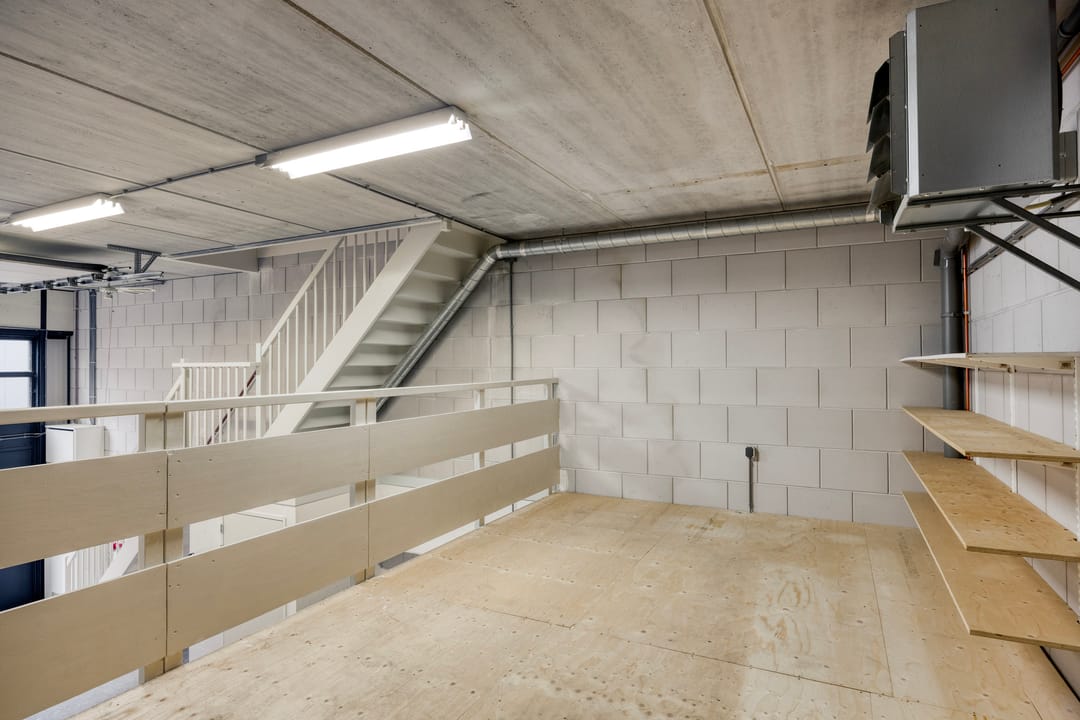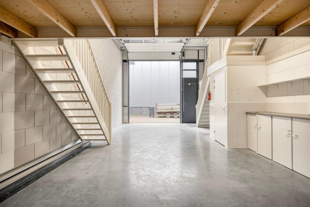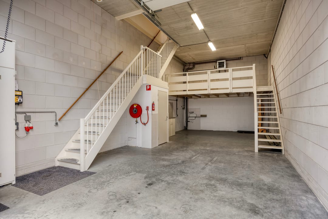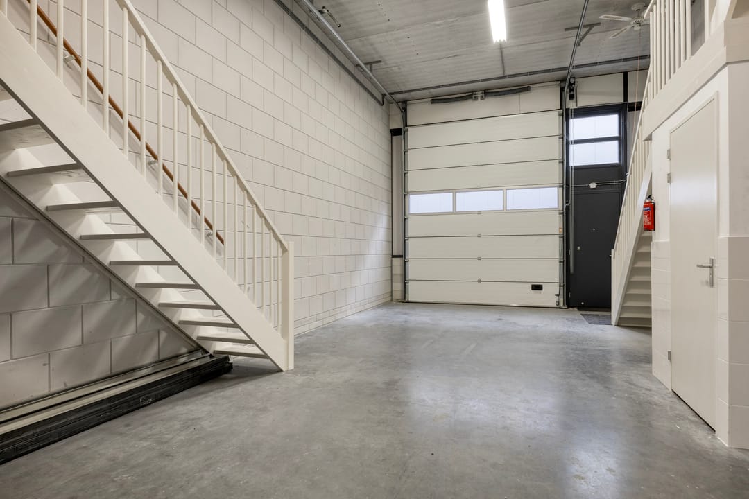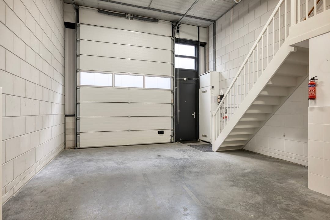De bedrijfsruimte is toegankelijk via een elektrische overheaddeur en beschikt over een vrije, efficiënte indeling met een betonnen vloer en goede daglichttoetreding. De entresol biedt praktische aanvullende opslagmogelijkheden. Op de begane grond is tevens een toiletgroep aanwezig.