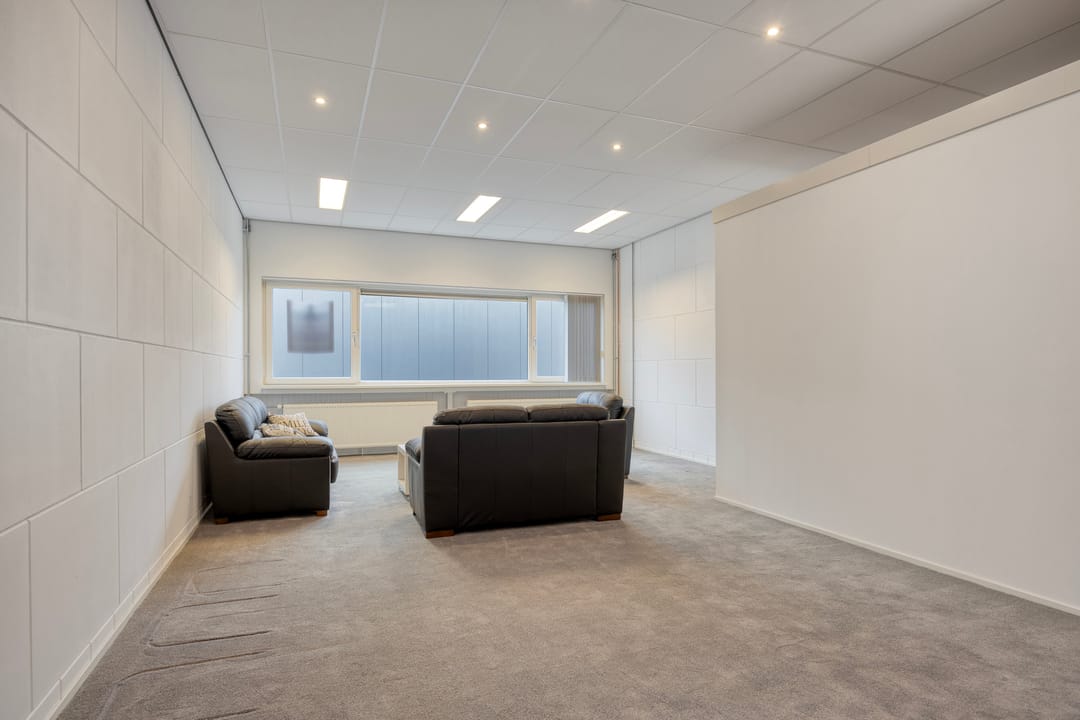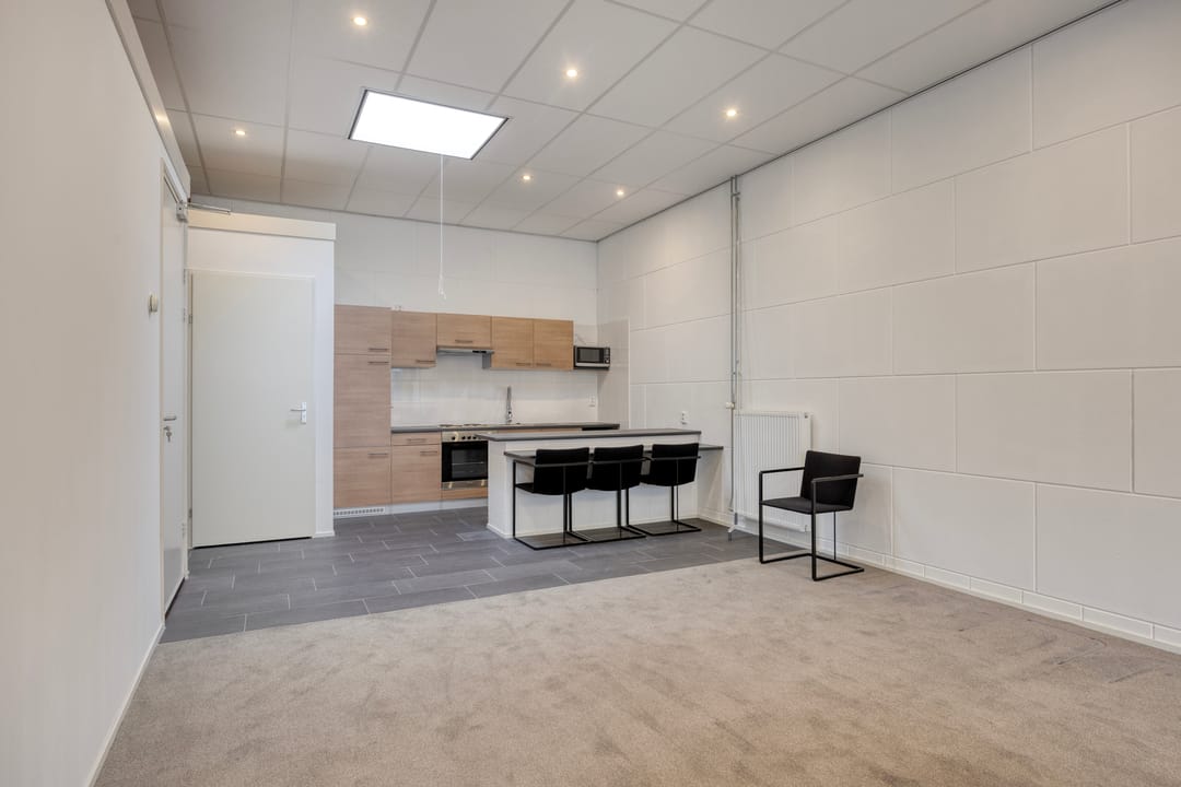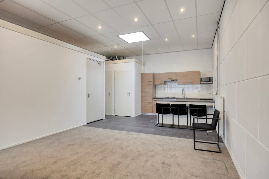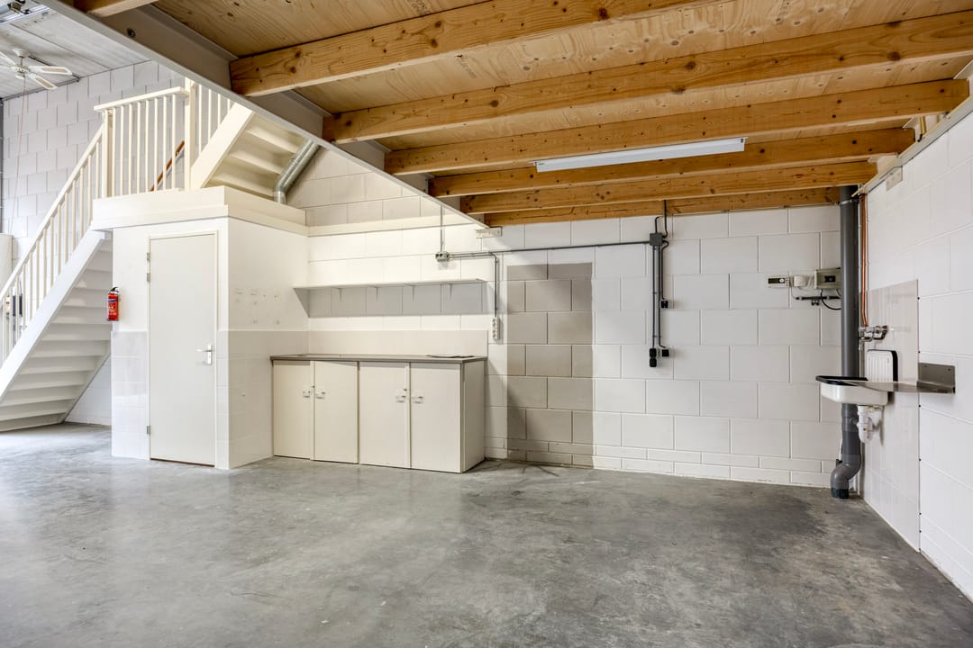 De kantoorruimte op de eerste verdieping is keurig afgewerkt en ingericht met een uitgebreide keukenopstelling, geschikt voor lunch- en overlegmomenten. Daarnaast is ook hier een separate toiletvoorziening aanwezig. De combinatie van bedrijfsruimte met volwaardige kantoorvoorzieningen maakt deze unit uitermate geschikt voor ondernemers die opslag, werkplaats en kantoor onder één dak wensen te combineren.