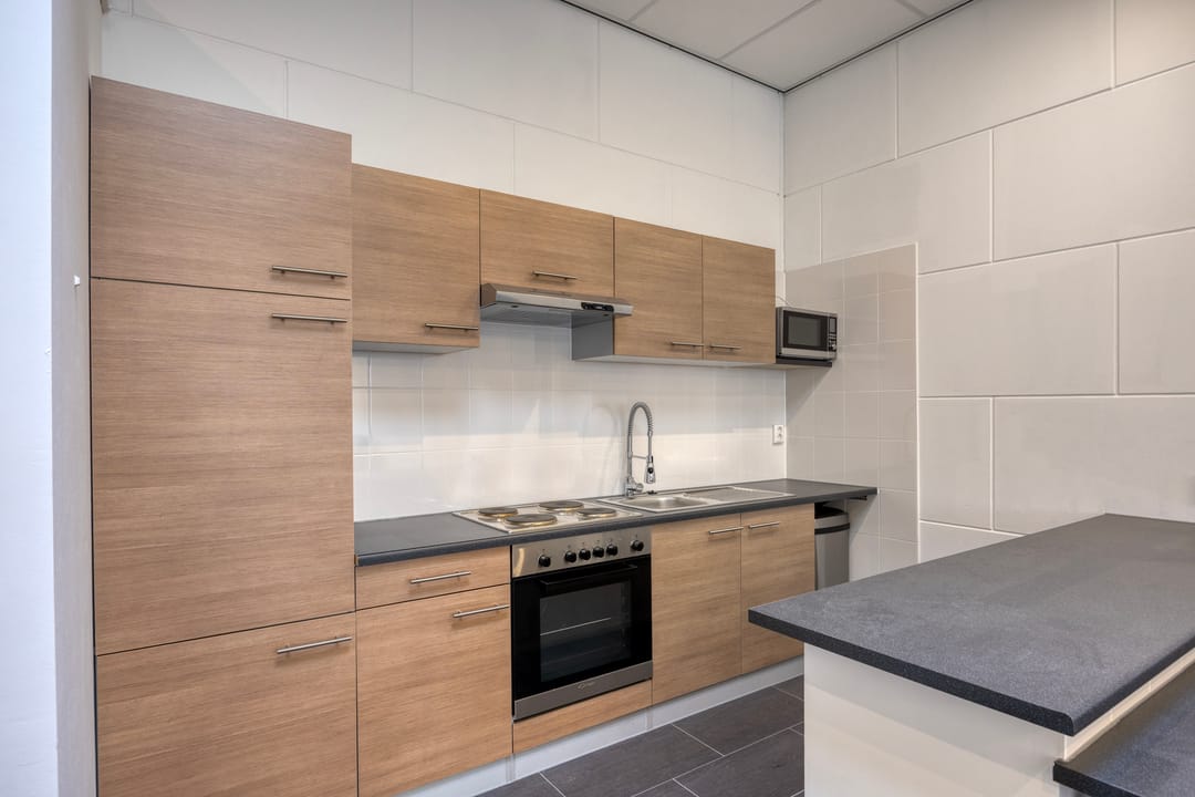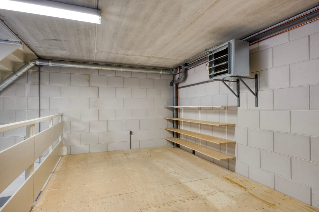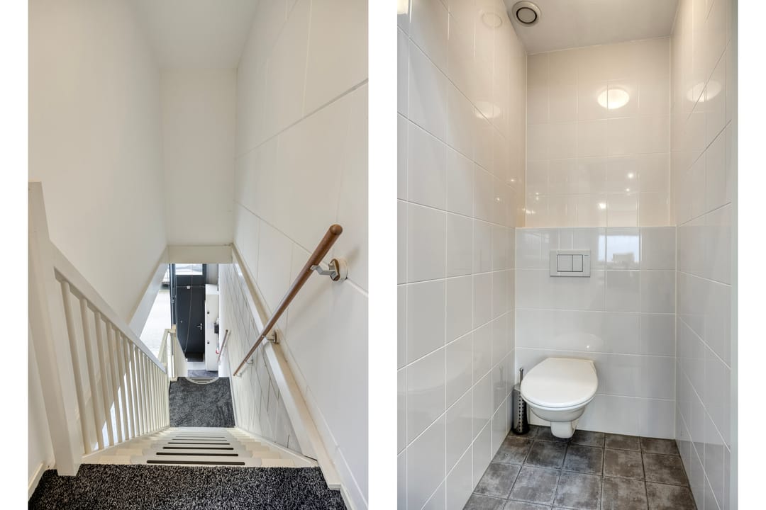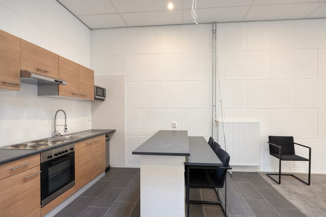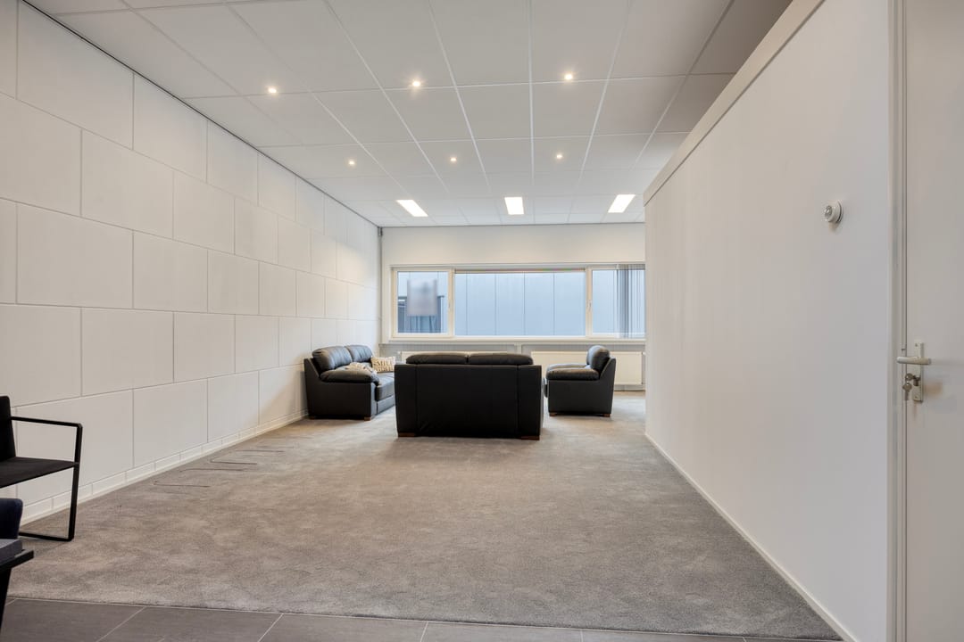 De kantoorruimte op de eerste verdieping is keurig afgewerkt en ingericht met een uitgebreide keukenopstelling, geschikt voor lunch- en overlegmomenten. Daarnaast is ook hier een separate toiletvoorziening aanwezig. De combinatie van bedrijfsruimte met volwaardige kantoorvoorzieningen maakt deze unit uitermate geschikt voor ondernemers die opslag, werkplaats en kantoor onder één dak wensen te combineren.