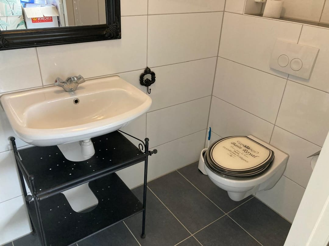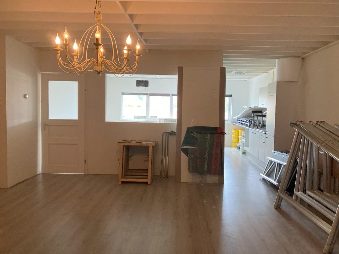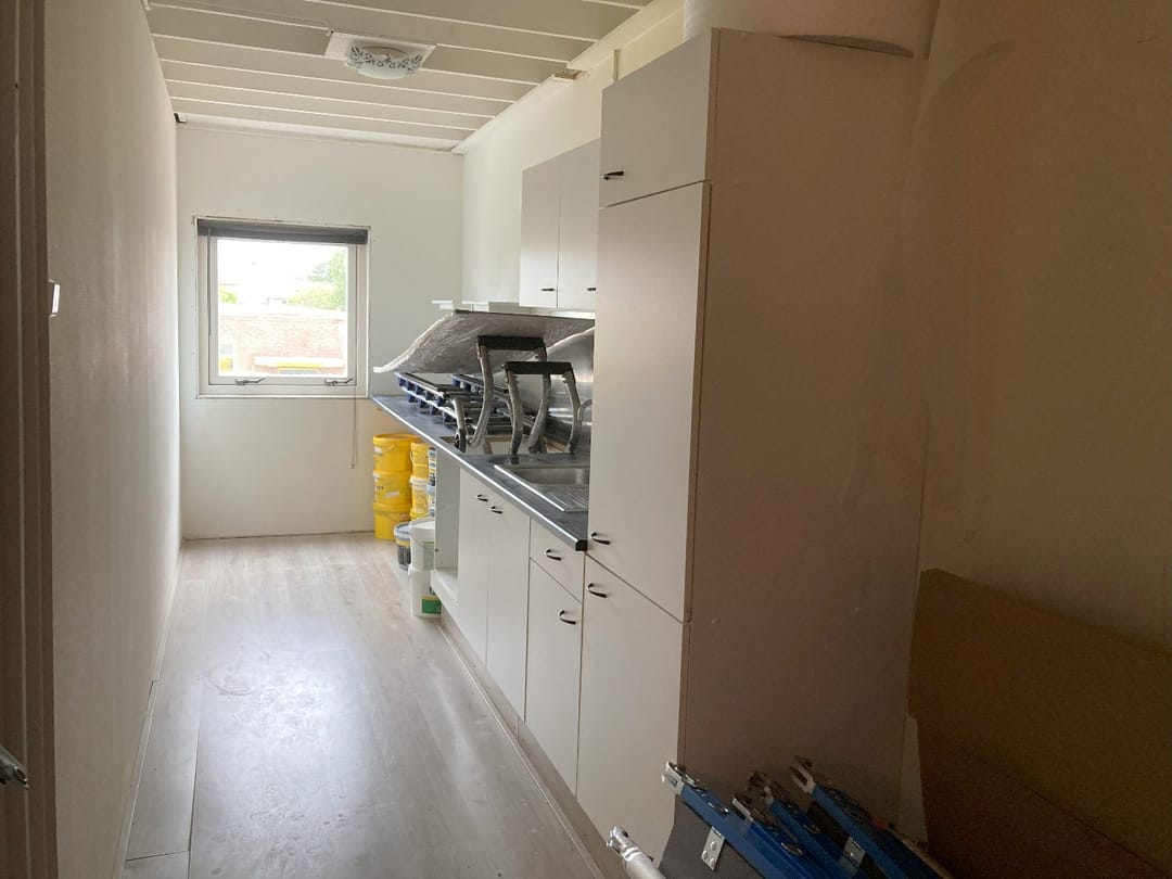 - Ruime keuken met koelkast, voldoende keukenkastjes, spoelbak met warm en koud water
