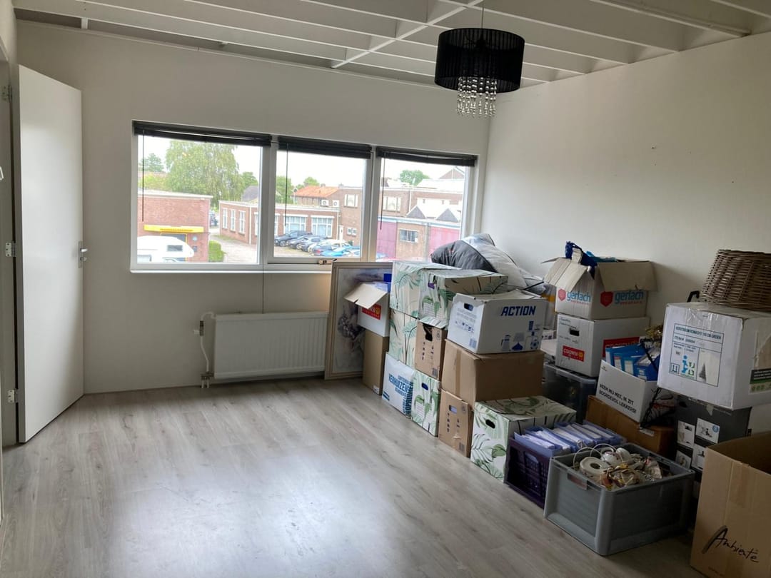 Begane grond: entree met een deur naar de hal en een trap naar de verdieping. De unit op de begane grond is voorzien van basis verlichting en houten stellages. De ruimte op de verdieping is verdeeld in een kantoorruimte, toiletruimte, ruime keuken en opslagruimte.