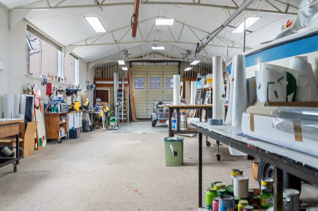 De hal is praktisch van opzet en biedt voldoende ruimte voor werkbanken, machines en opslagstellingen. Daarnaast is er een overheaddeur aanwezig, wat laden en lossen eenvoudig maakt.