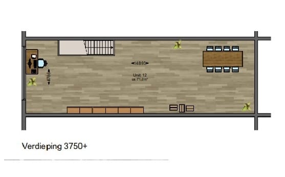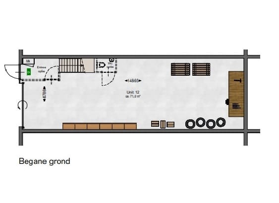 - Bedrijfsunit (70,2 BVO) en eerste verdieping kantoor (70,2 BVO);