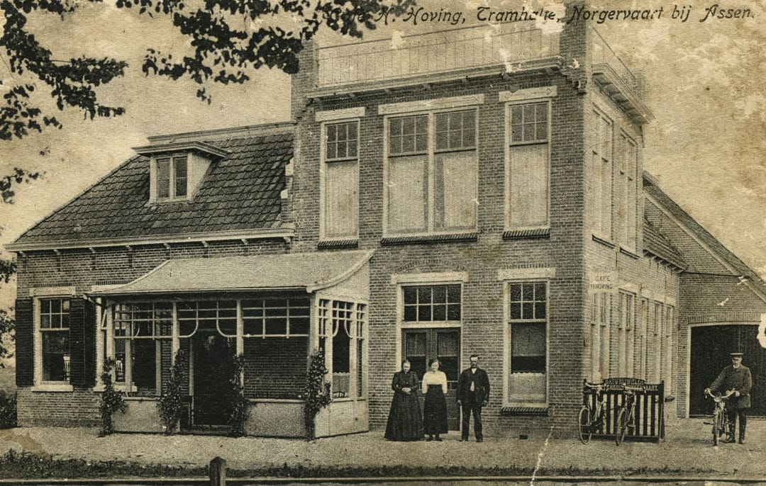 Historie: het pand werd rond het jaar 1900 gebouwd als hotel Hovingh en diende als tussenstop langs de tramroute tussen Assen en Oosterwolde, geëxploiteerd door de Nederlandse Tramweg Maatschappij (NTM). De schuur had aan beide zijden een doorgang voor paard en wagen, waarmee reizigers direct konden overnachten in het hotel. Wat tegenwoordig de voorzijde is, was oorspronkelijk de zijkant van het pand – de oude voorkant had bordes dat toegang bood tot het tramperron.
