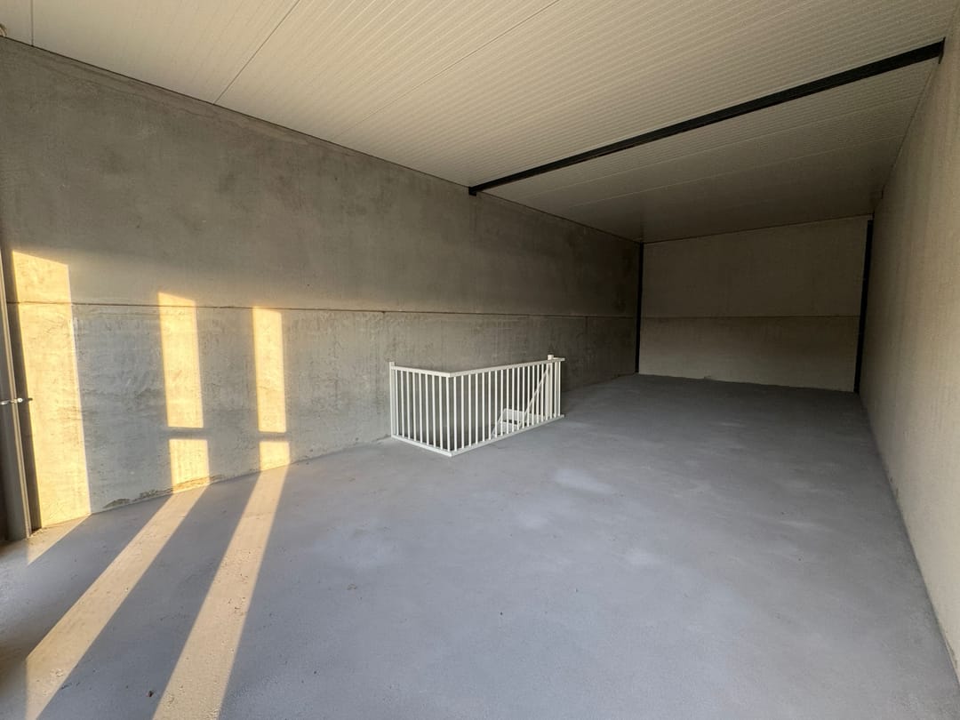 - Overheaddeuren, betonvloer, toilet en pantry