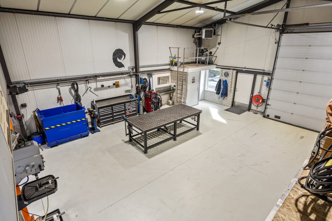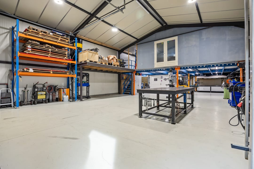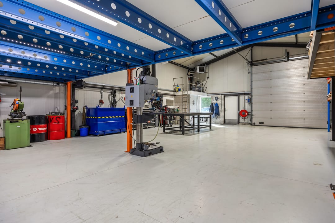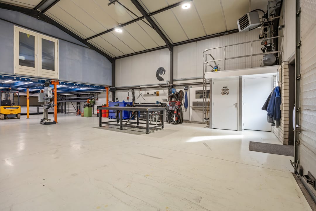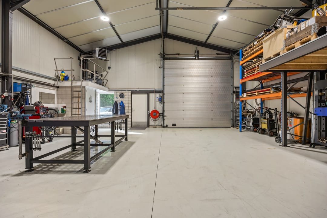 De bedrijfsruimte is opgetrokken in staalconstructie en voorzien van geïsoleerde golf(dak)platen. De toegang is middels een sectionaaldeur (4*4 meter) en een loopdeur; Gecoate betonvloer; krachtstroomaansluitingen; gasheater; op de entresolvloer zijn een tweetal kantoren gerealiseerd voorzien van airco-units, verlichting en laminaatvloeren.