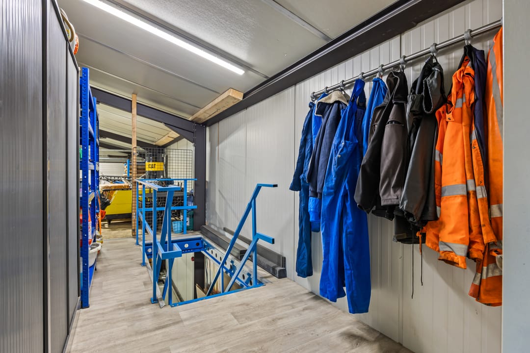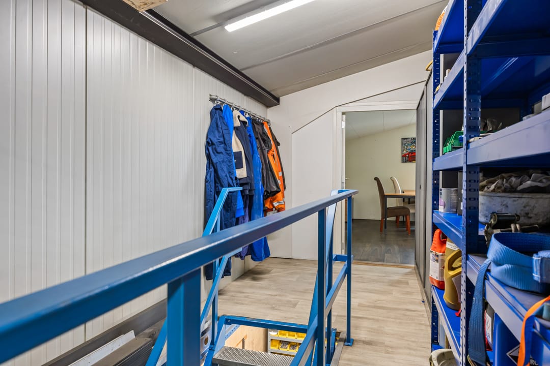 Toegang middels een loopdeur en een elektrische overheaddeur. In de bedrijfshal is een toilet gesitueerd met daarnaast een stalen wasbak. In de bedrijfshal is een separate opslagruimte gecreëerd.