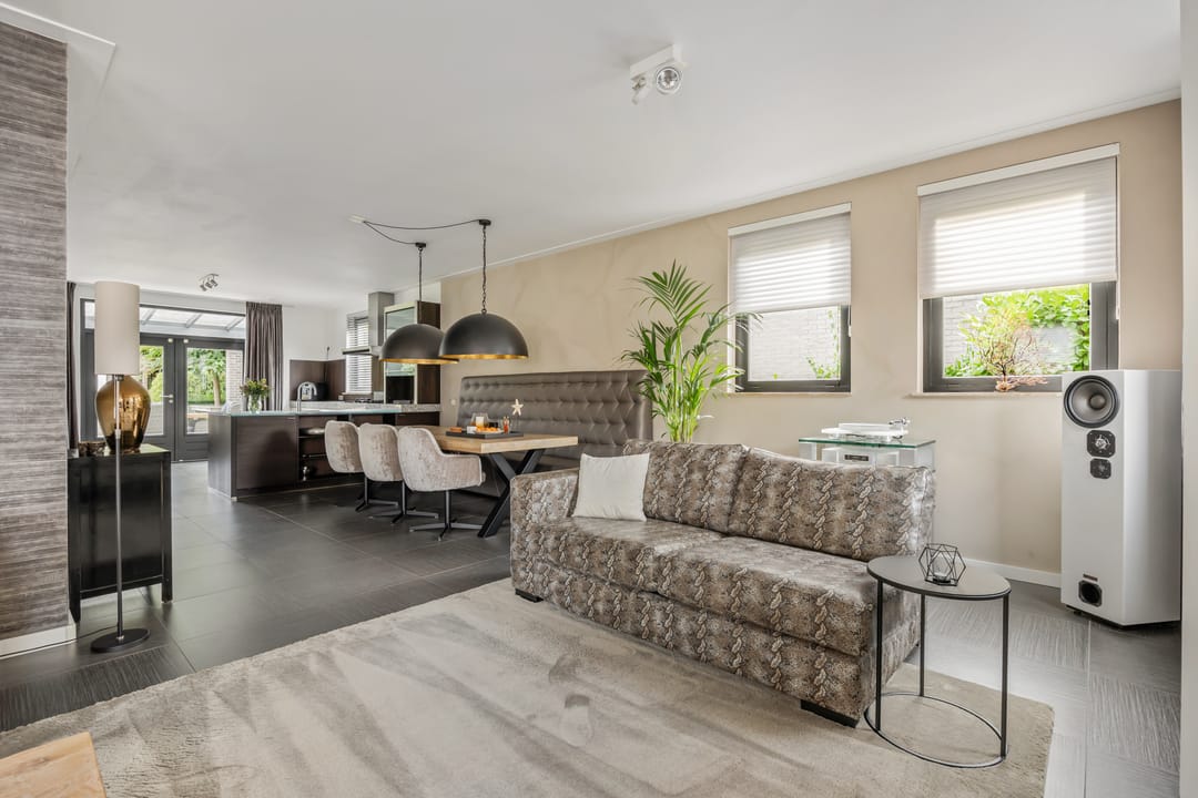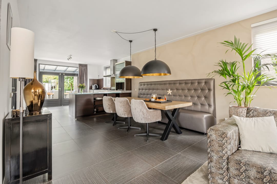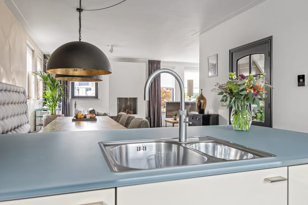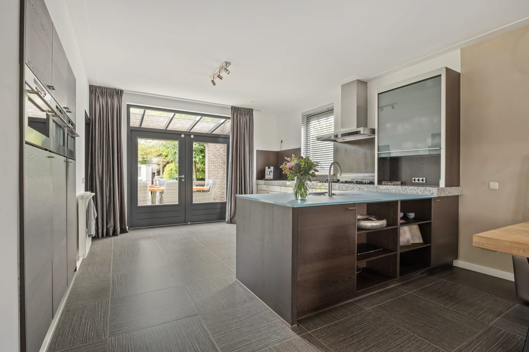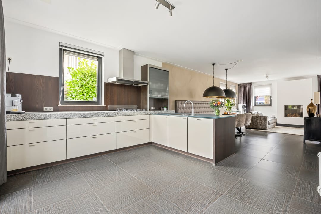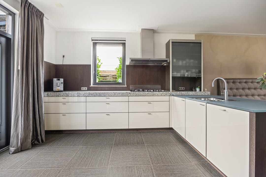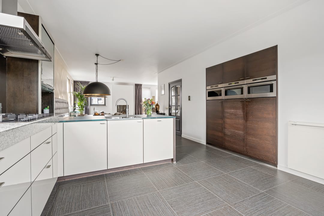 De open keuken is voorzien van luxe inbouwapparatuur, waaronder een hete luchtoven, stoomoven, combimagnetron, vaatwasser, koelkast, vriezer, 5 pits gasfornuis, RVS afzuigkap en een Quooker. Het keukenblad is van graniet en deels van glas.
