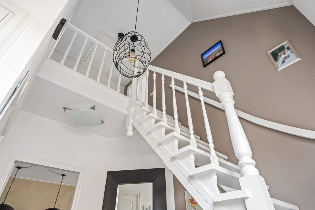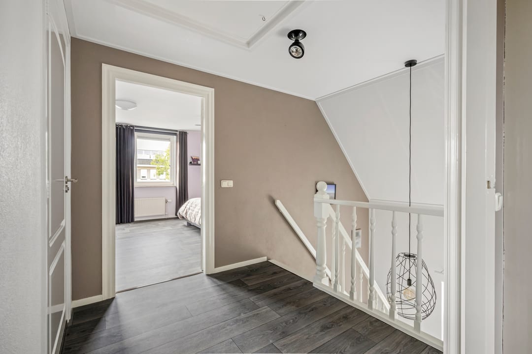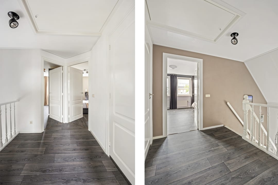 Fraaie open overloop met een vlizotrap voor de tweede verdieping; 3 slaapkamers van respectievelijk ca. 24 m², ca. 15 m² en ca. 15 m². Fraai afgewerkte badkamer (ca. 5 m²) met douche, toilet en wastafelmeubel.
