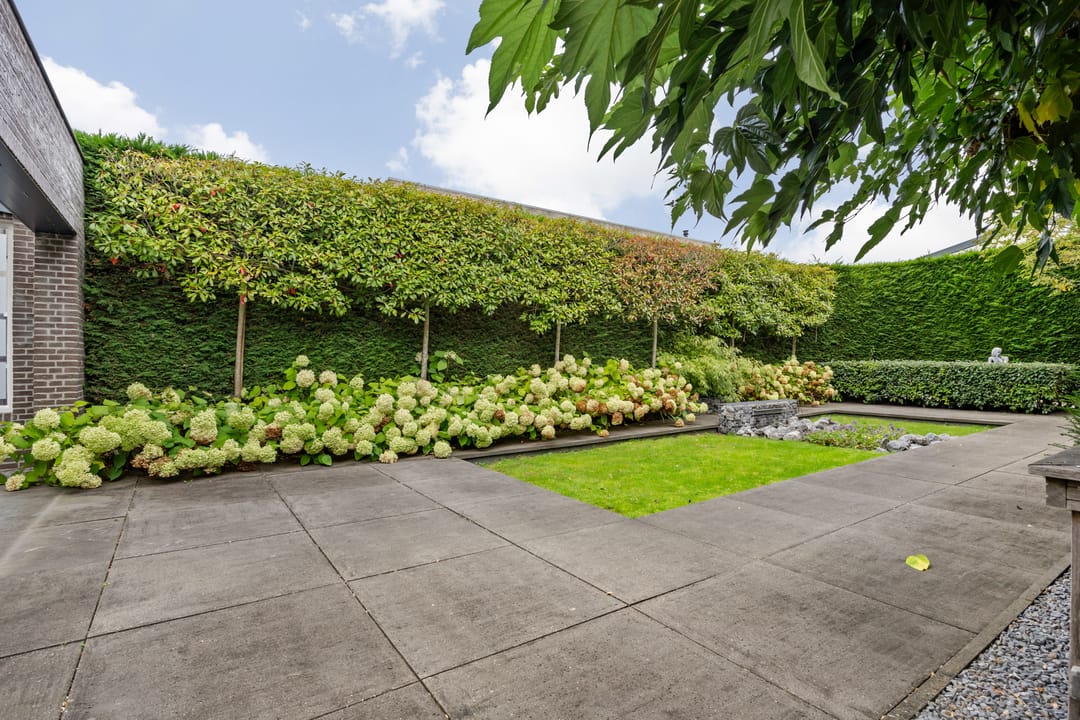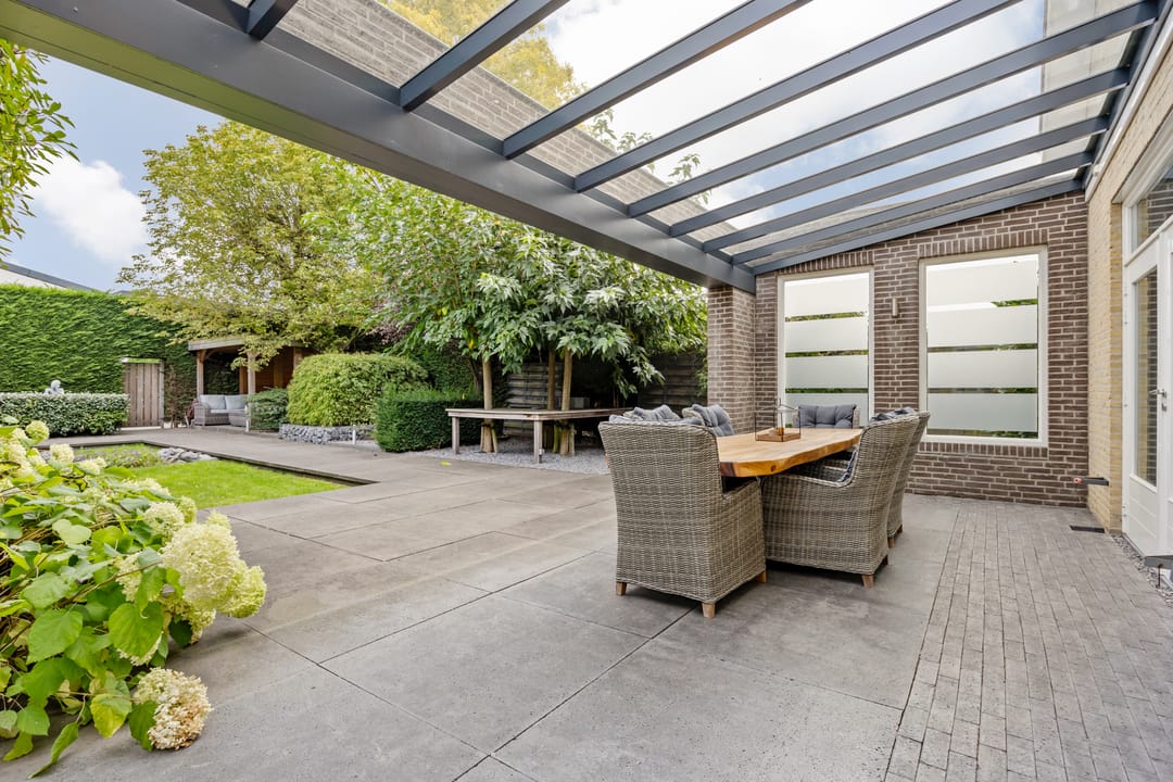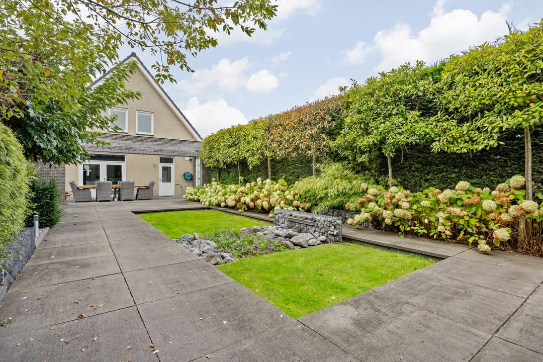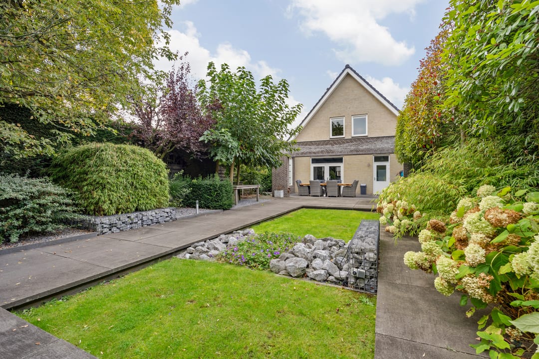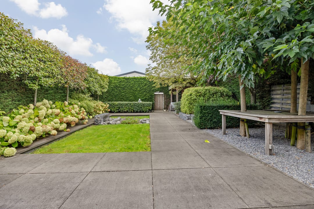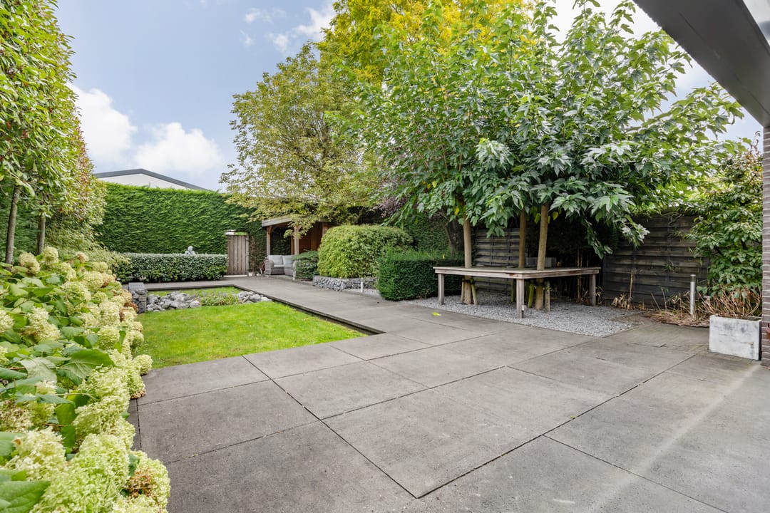 Fraai aangelegde tuin met veel privacy, diverse zonnige terrassen en een overkapping. Vanuit de tuin kan middels een poort toegang worden verkregen tot het terrein met de bedrijfshal.